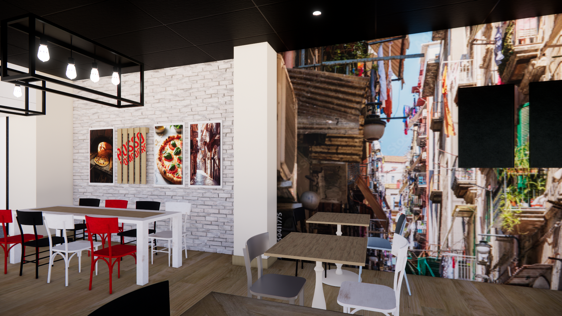transform the provided restaurant interior image into a high end photorealistic render do not change the materials do not change the proportions do not chnage or add furniture only render the existing materials more photo realistic the brick is white bleached brick with light colored groun the photo on the wall is a wall paper the red black and white chairs are all on painted wood which shows some of the wood grain add a few people eating pizza sitting in the chairs in their current positions
