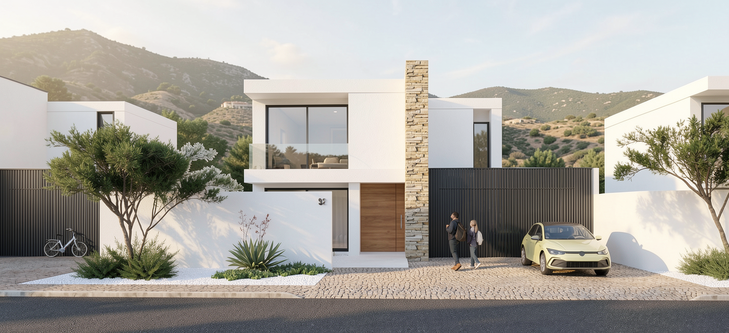 use the provided image as strict base reference preserve the original architecture composition camera position framing proportions and scene layout exactly as they are do not redesign reinterpret or add remove elements objective enhance the image to achieve a high end architectural editorial look refined poetic visually rich and photorealistic without altering the original design materials textures refinement improve realism of all materials stone plaster metal glass pavement add subtle micro texture and natural imperfections introduce slight tonal variation to avoid flat or repetitive surfaces maintain material authenticity no stylization no exaggeration avoid overly sharp noisy or artificial textures light atmosphere strict control preserve the original light direction and logic exactly do not change sun position or shadow orientation refine lighting to be more natural and photographic softer highlights balanced contrast gentle shadow transitions introduce a subtle atmospheric depth very light haze if needed avoid dramatic cinematic or artificial lighting effects reflections surfaces make reflections more physically accurate and slightly softer avoid mirror like or overly perfect reflections ensure correct roughness on all materials color grading apply a subtle editorial color grading slight desaturation for realism maintain a natural warm mediterranean tone if applicable avoid hdr look or excessive contrast vegetation context slightly reduce artificial appearance of vegetation add natural variation in tones and density keep everything controlled and not overgrown overall style architectural digest high end european editorial photography clean calm intentional composition poetic but restrained photorealistic not cgi looking critical constraints very important no change in architecture no change in composition no change in camera or framing no change in proportions no change in layout no added or removed elements no change in light direction no exaggerated textures no dramatic effects light sun comes from the left side