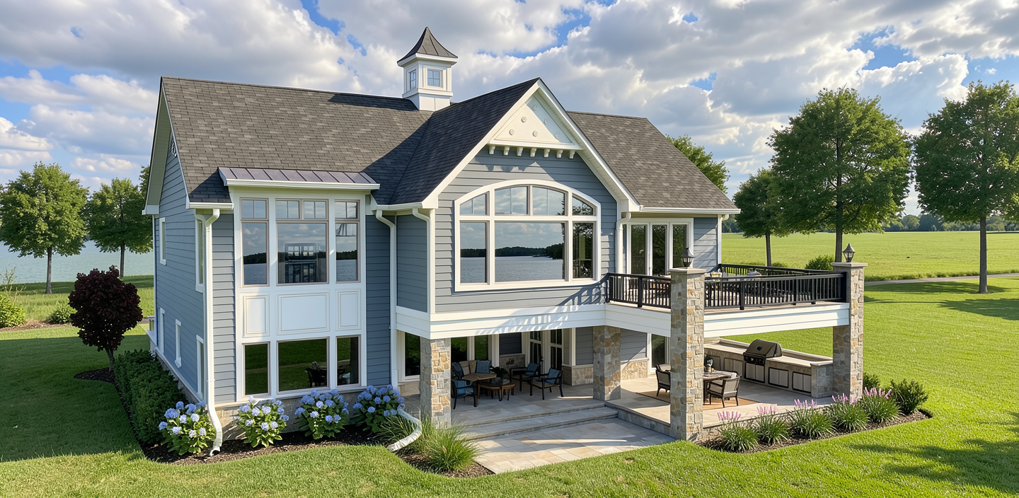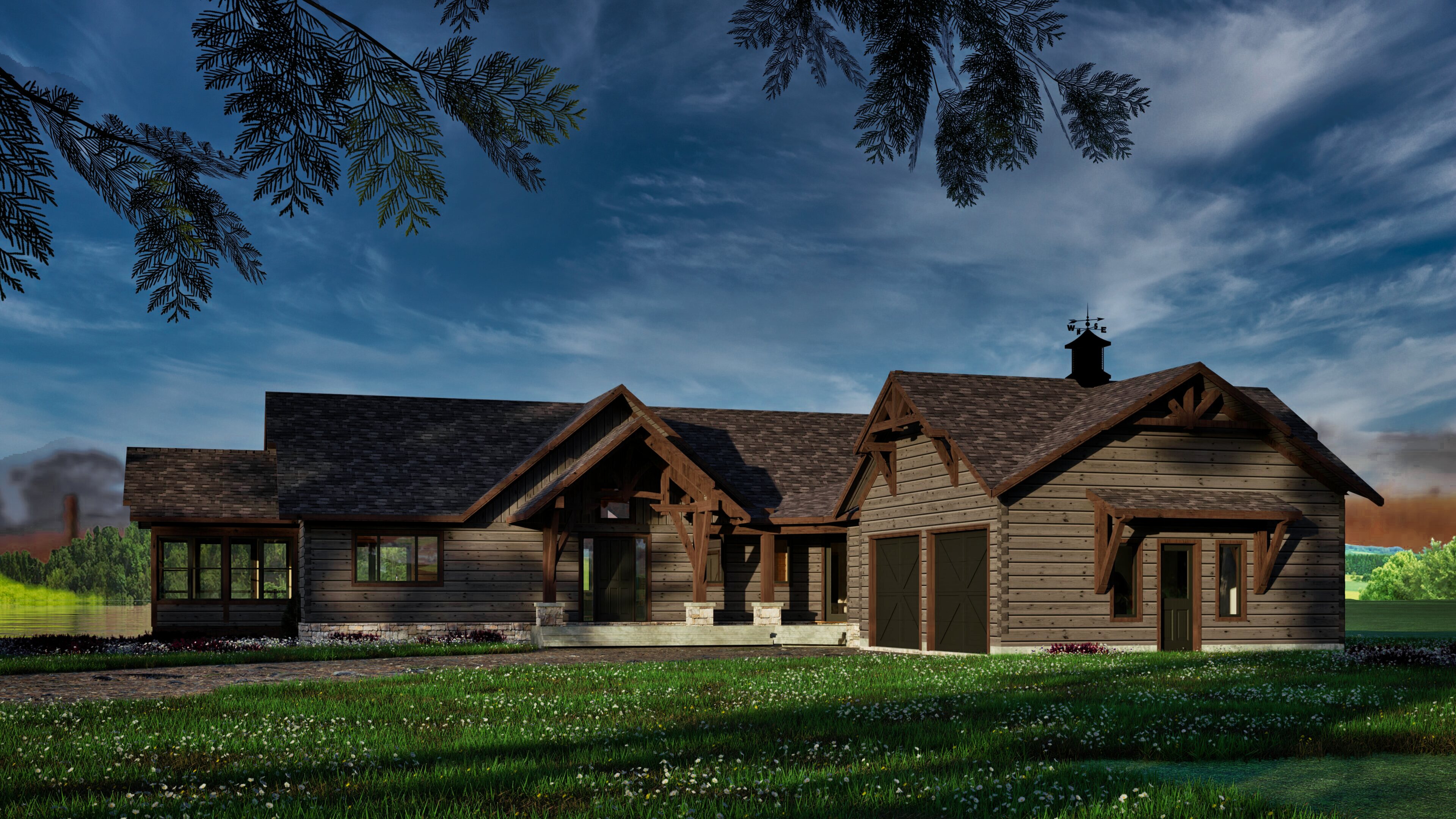 make this render look realsitic add some trees found in ontario in the background place this building on a farmland not a lake front this is also a flat land so no stones