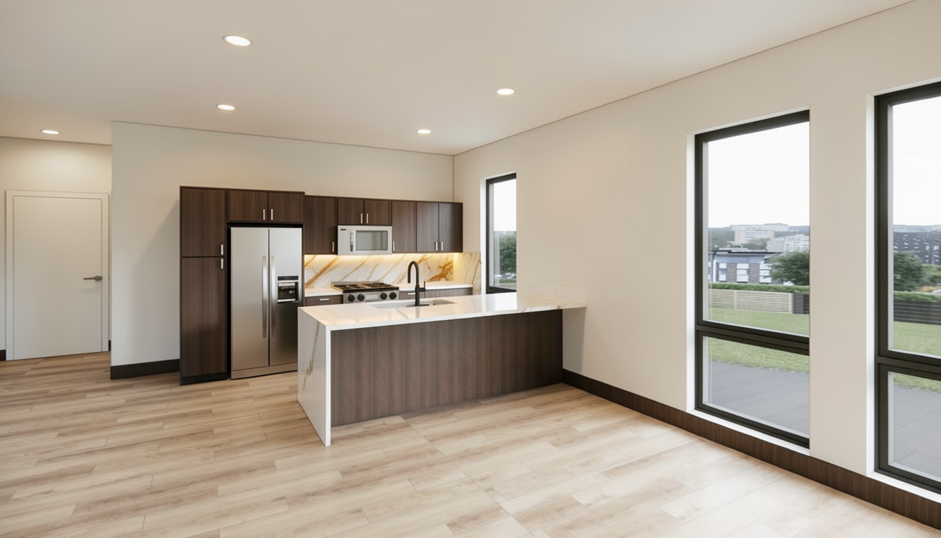 no cinematic lighitng avoid golden hour soft overhead lighting only make the backsplash between the upper and lower cabinets a veined warm white marble