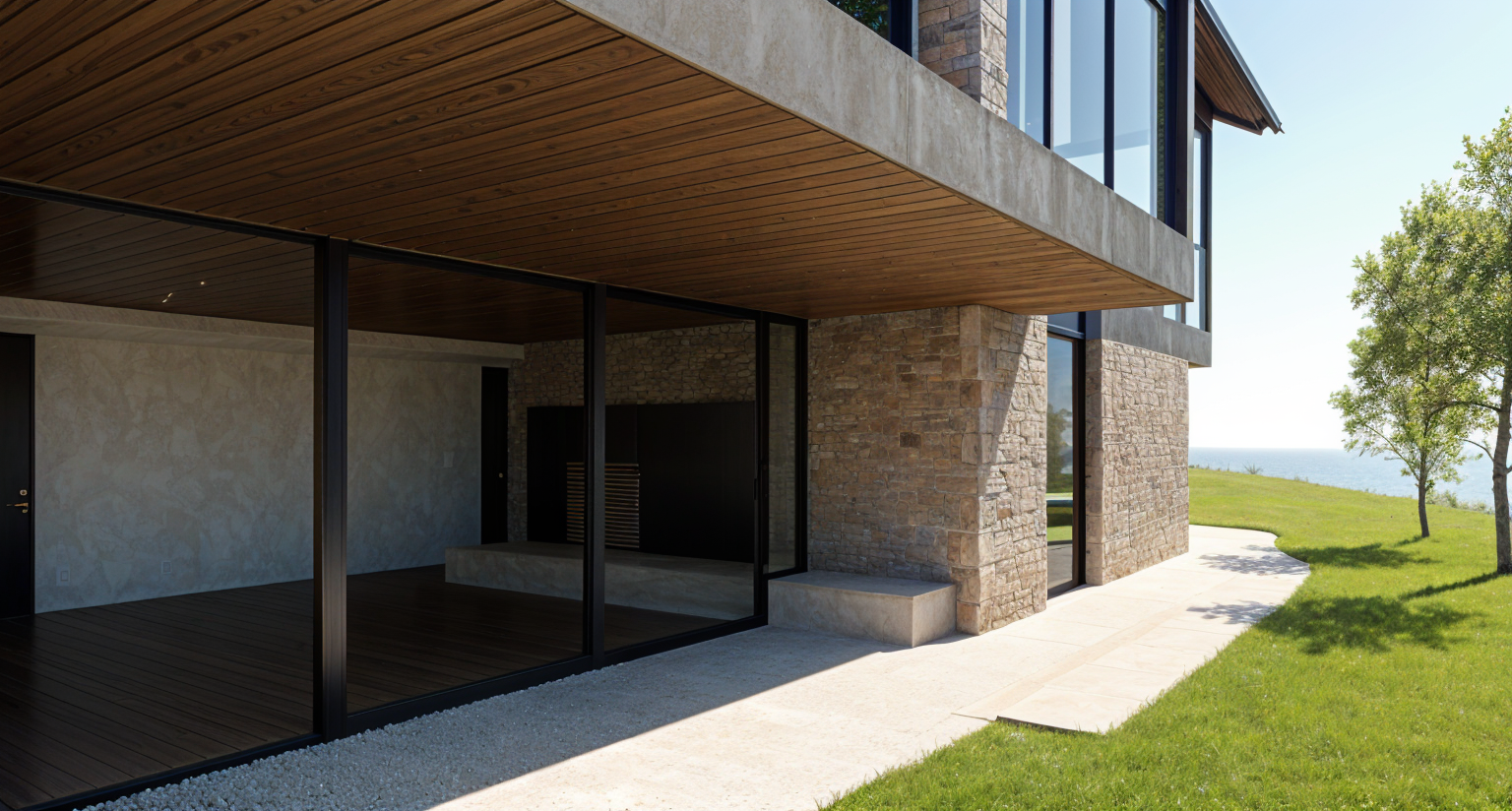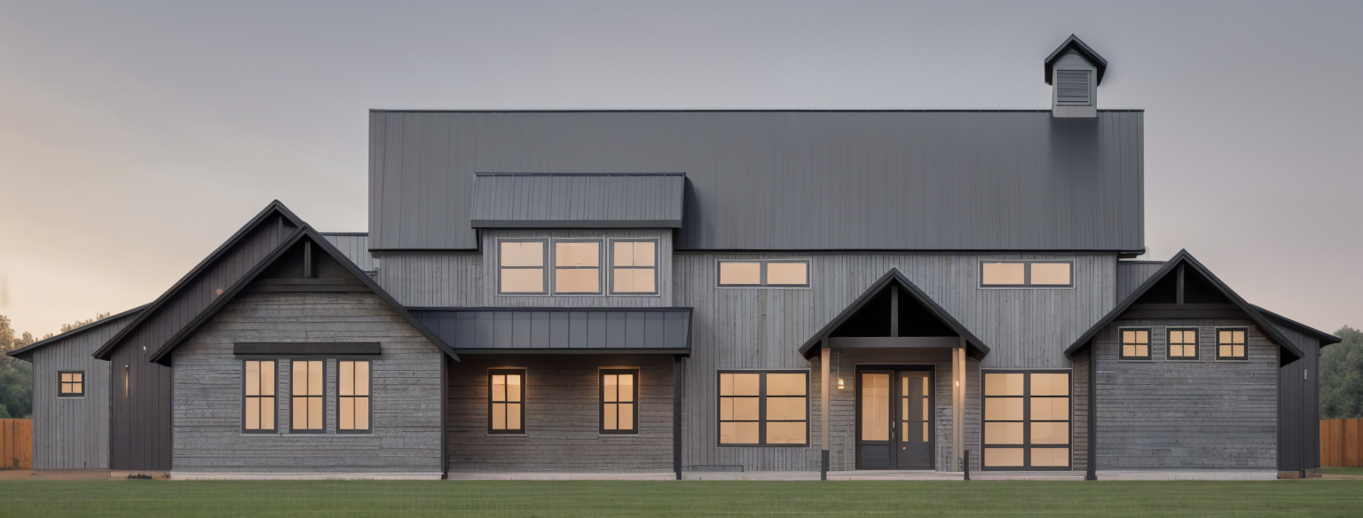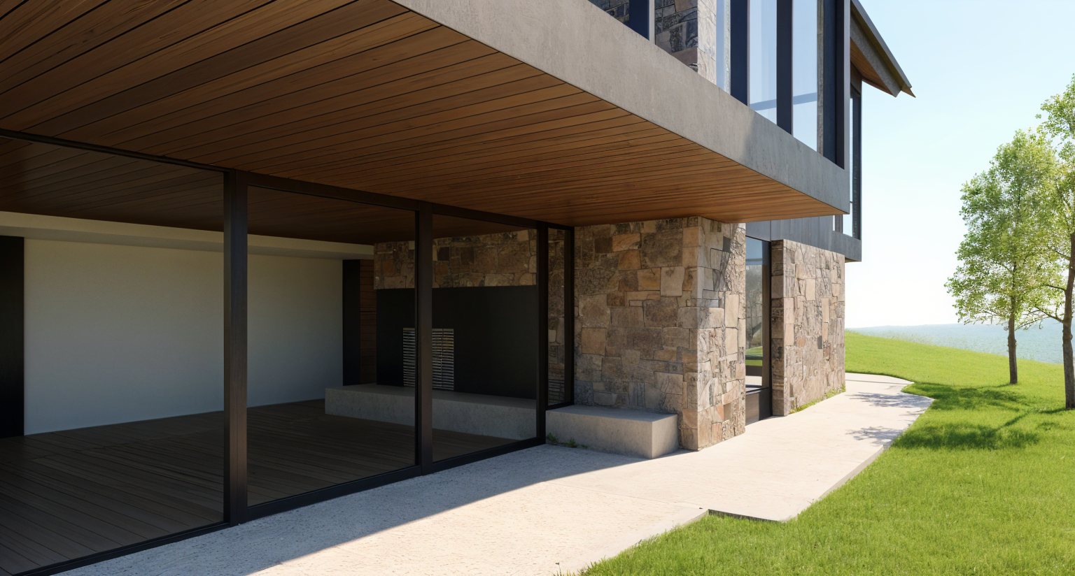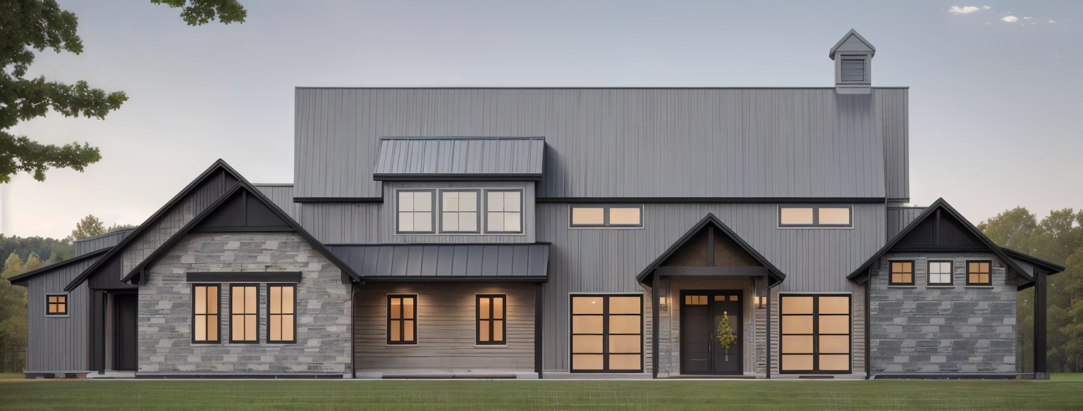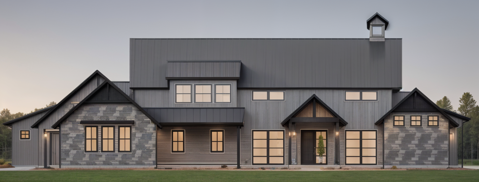 realistic exterior rendering of a custom suburban home with flat and sloped rooflines mix of stucco stone and wood cladding large glass openings modern garage doors landscaped driveway with interlock and shrubs dusk lighting with warm interior glow