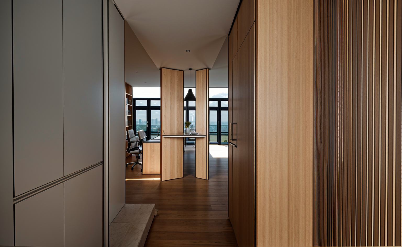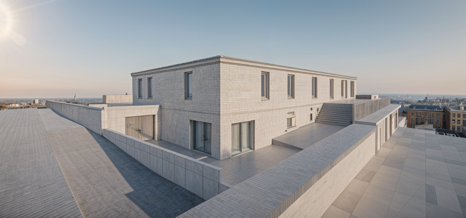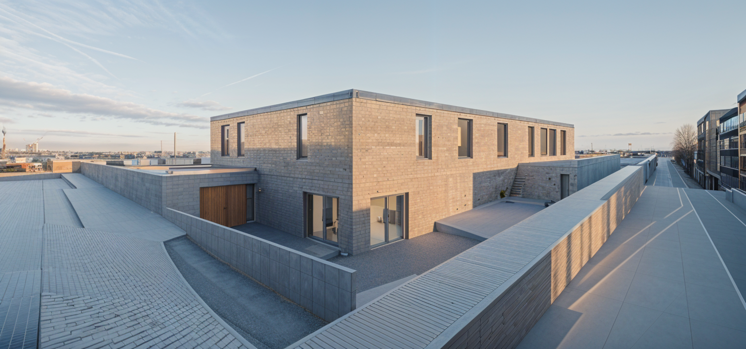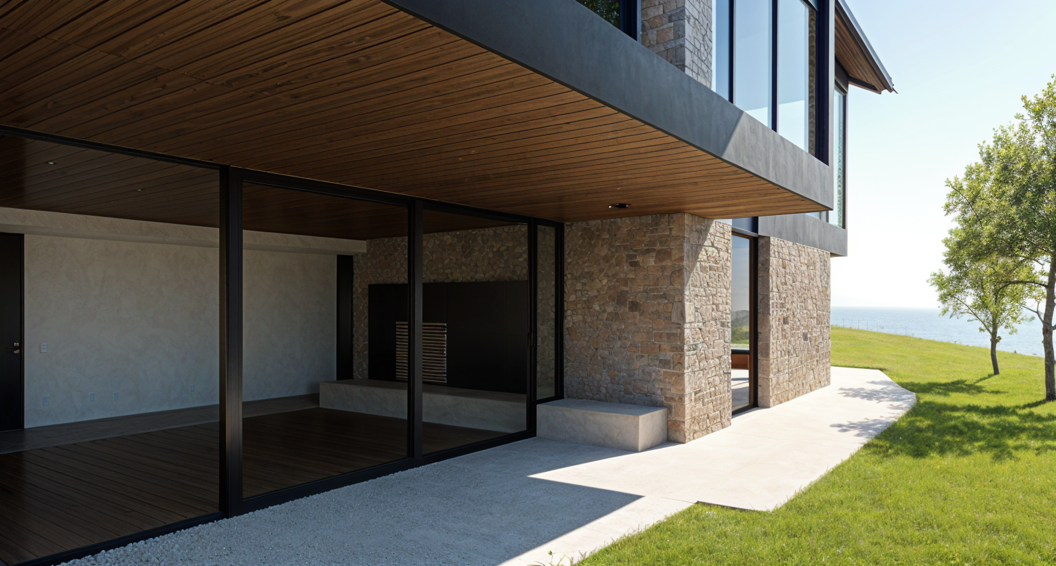 realistic exterior rendering of a custom suburban home with flat and sloped rooflines mix of stucco stone and wood cladding large glass openings modern garage doors landscaped driveway with interlock and shrubs dusk lighting with warm interior glow
