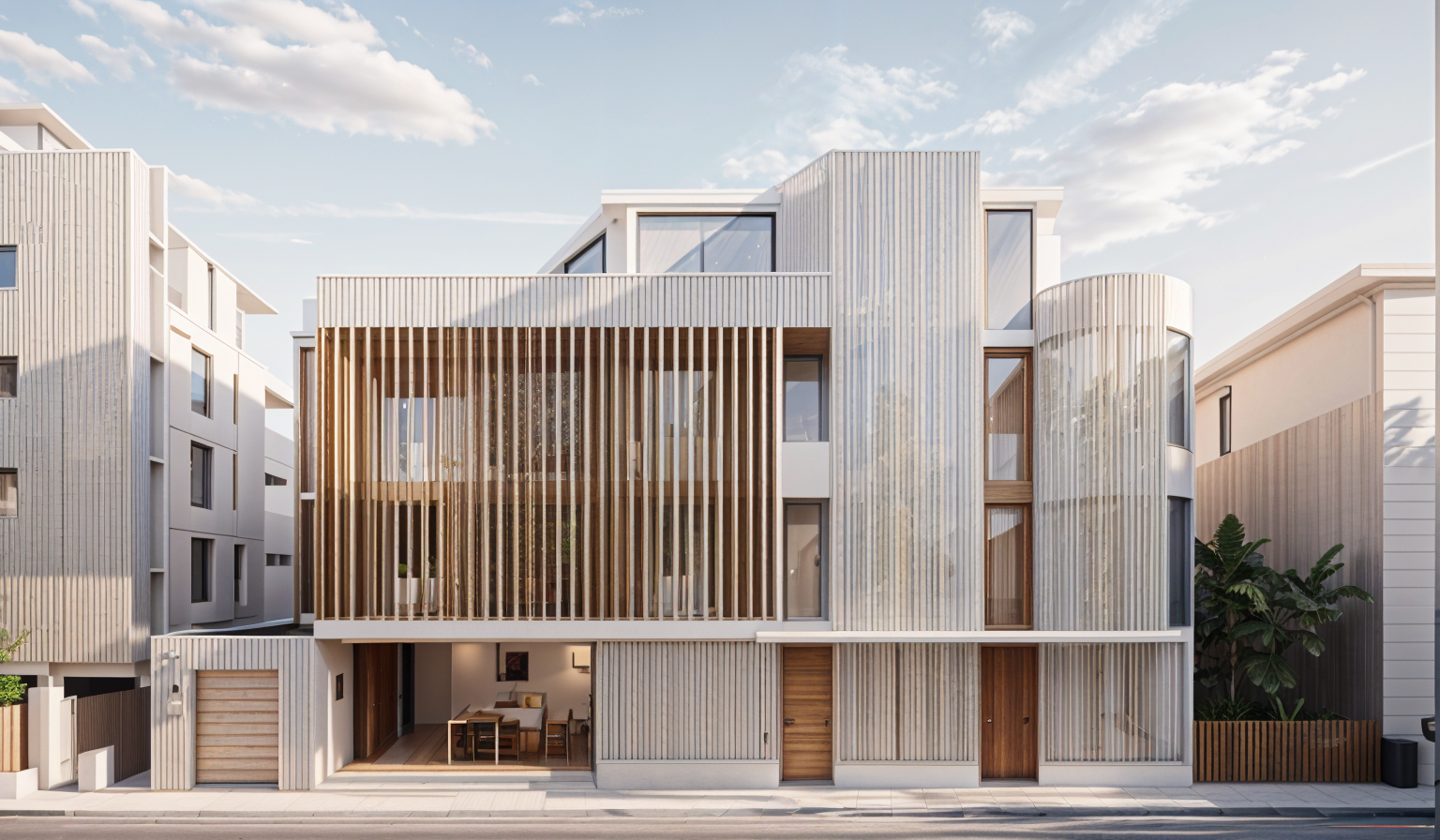 white stucco exterior black windows trim black fascia black gutters black door metal awnings wood and metal railings grass in foreground concrete driveway