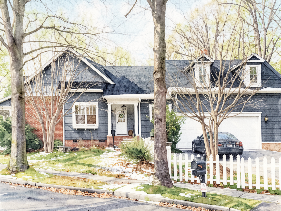 render of this house maintaining it s current materials watercolor trees and landscaping surrounding the building change the color of all the horizontal white siding on the house to match the color kendall charcoal from the benjamin moore color palette change the color of the siding on the gables to match the color kendall charcoal from the benjamin moore color palette remove the car and the mailbox
