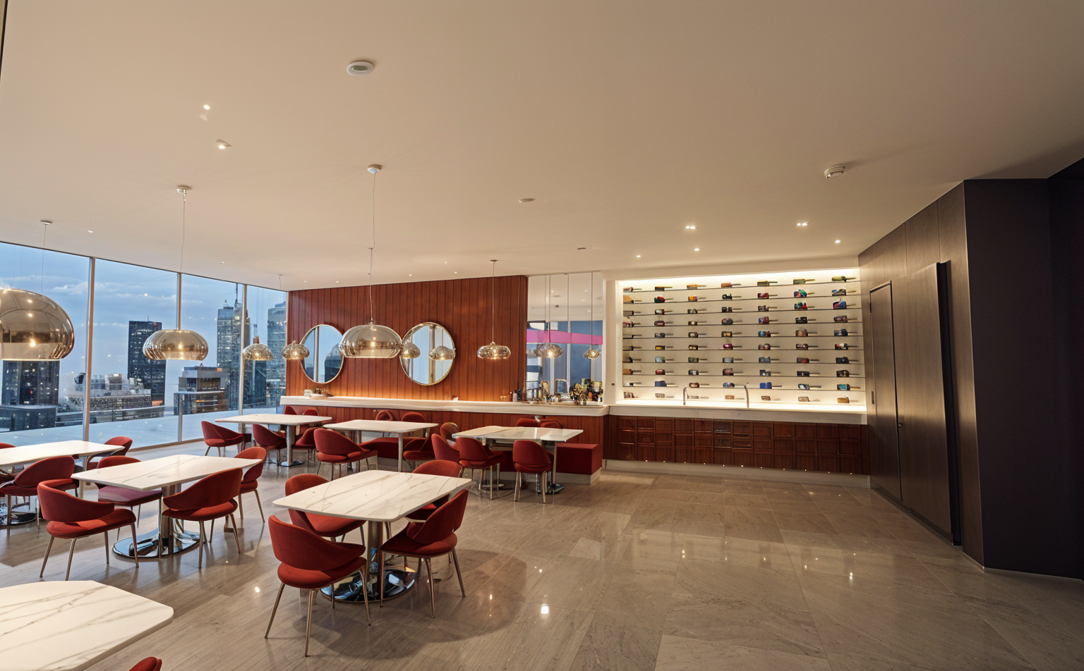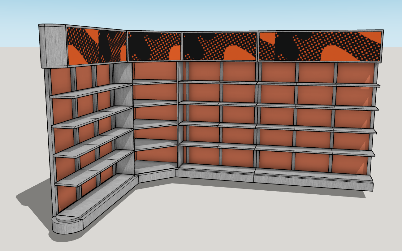 render a vibrant anime merchandise store the walls are adorned with a bold orange and cream pop art design creating a lively atmosphere all retail fixtures and cash register are a brushed silver material and the back of the shelving are a glowing orange through frosted acrylic there is undershelf lighting in a warm orange glow the screens on top of the shelving and the front of the cash register are tv s with the same imagery as the back wall the floor is a dark grey stained concrete shelves are filled with colorful figurines and collectibles while neatly arranged clothing hangers display stylish anime themed apparel in black and gray the countertops are sleek with modern laptops and a black cash register the store gives a futuristic yet inviting ambiance combining a concrete textured floor with clean sharp lines and strong lighting that accentuates the bright and varied merchandise creating an energetic and exciting shopping environment