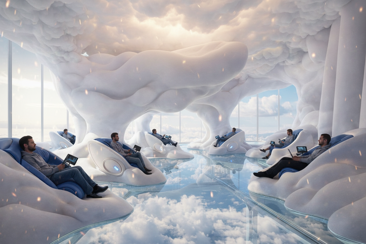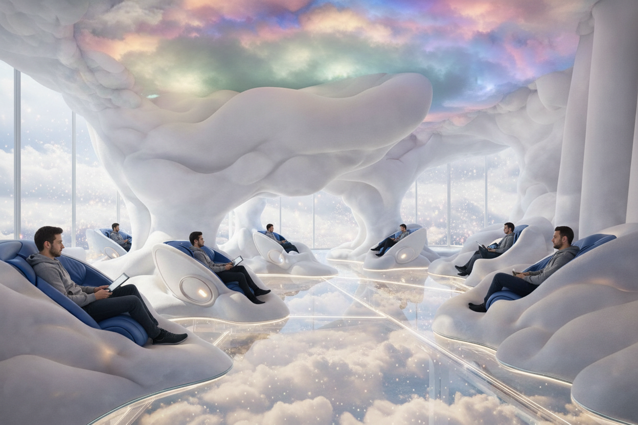 modernist exterior shot following the style whatever is given make the front of my office look as realistic as possible make the lighting look appropriate and the blue logo with white letter make it light up as well architecture