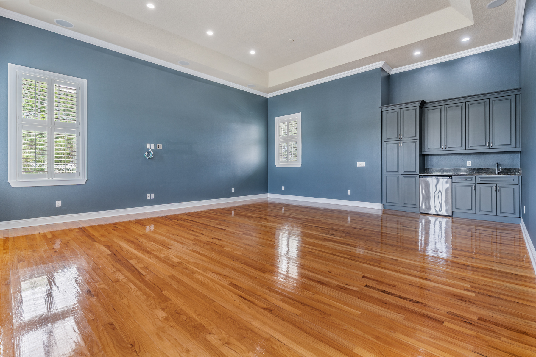 stage this room as a home theater room with projection screen on the left side wall theater chairs wall sconces and soundproofing panels
