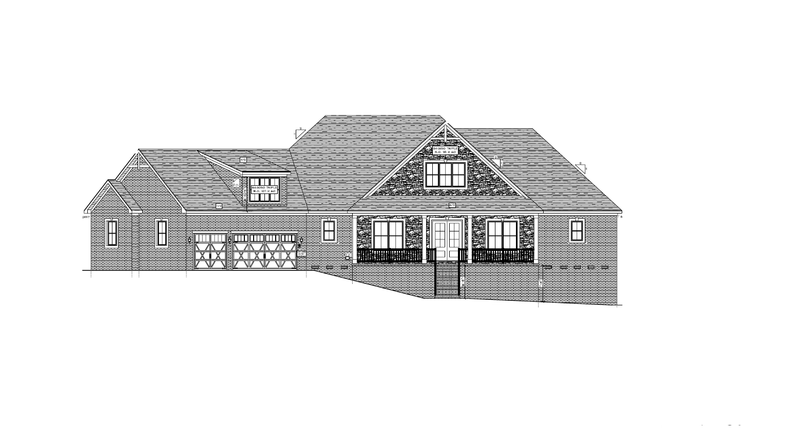 make as photorealistic as possible while keeping textures the same as selection professional landscaping in a lightly wooded scene with good lighting match materials to plan and remove any text medium brown roof light brown brick light grey stone in middle portion of the house white porch columns white windows