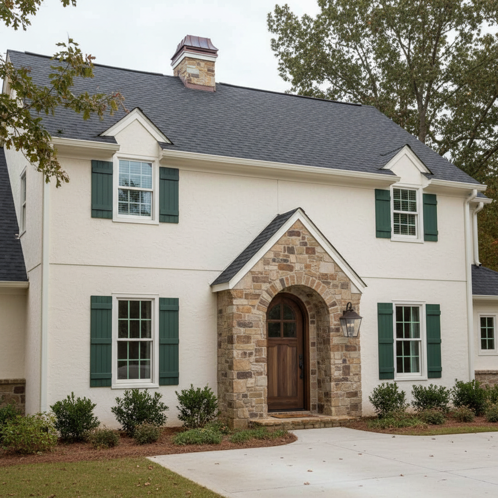 keep original structure as is change the siding to a creamy stucco and add a stone entry with arched front door and stone chimney with copper cap