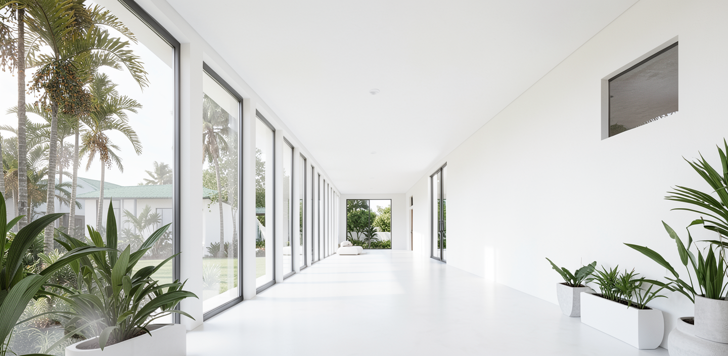 interior architectural visualization translating roof massing into a terraced ceiling landscape ceiling composed of broad horizontal terraces stepping up and down large scale architectural steps rather than small modulation no pitched roof reading no exterior references 14 foot high walls 12 foot tall floor to ceiling windows minimal white interior architectural interior view natural daylight priority ceiling as landscape and horizontal articulation
