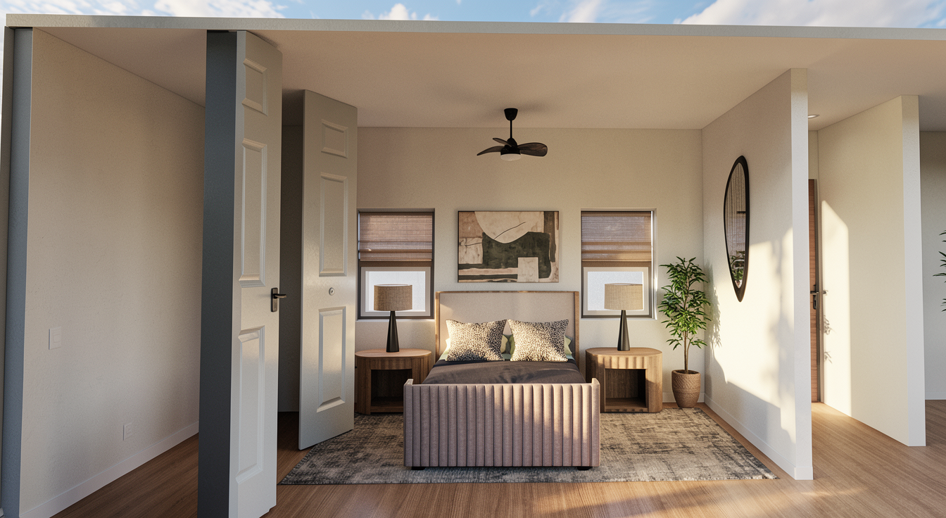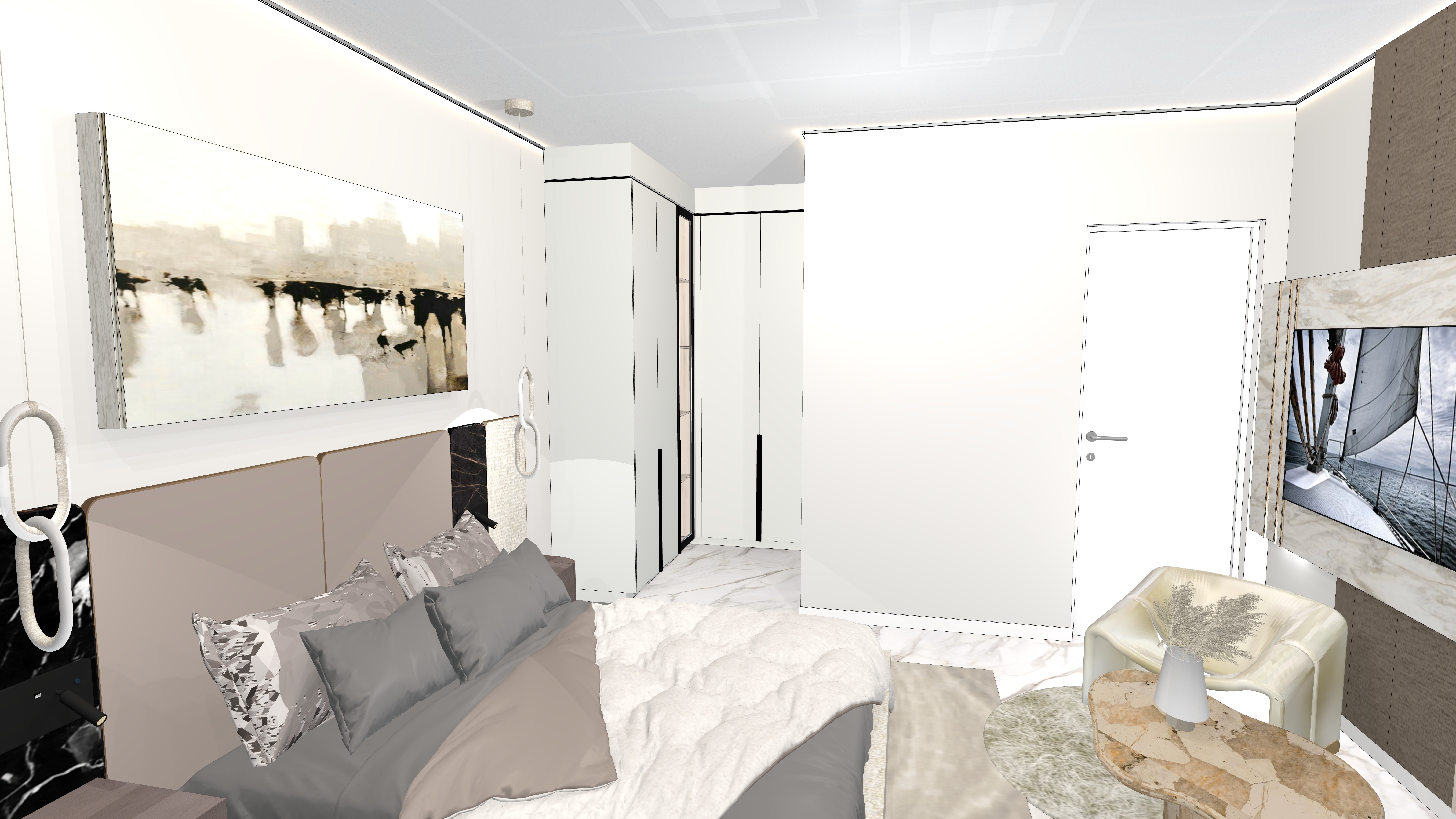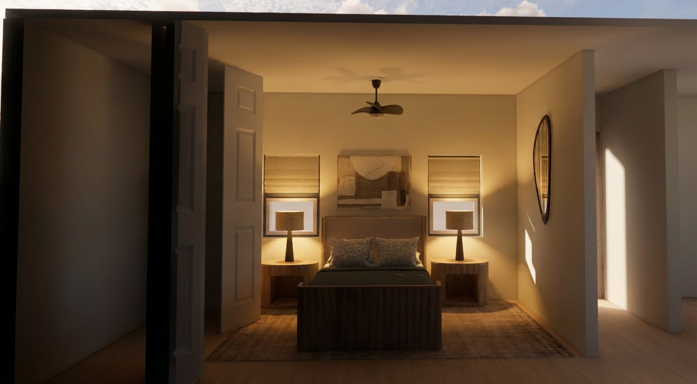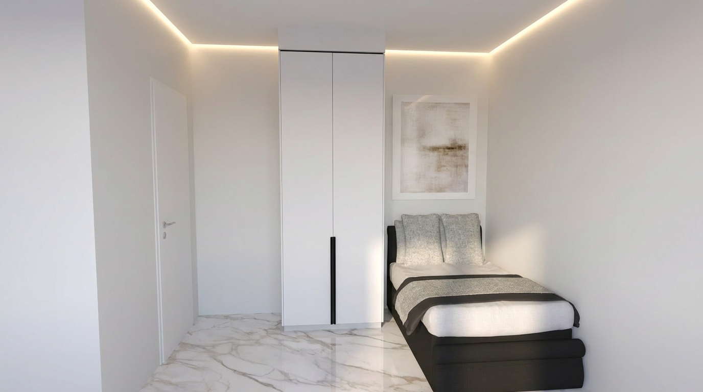 render in to a soft realistic guest bedroom with soft natural light ceiling cove led lighting