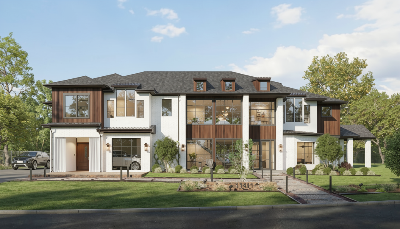 render the exterior make the house white and the roof black put the scene in montana make the center section wood