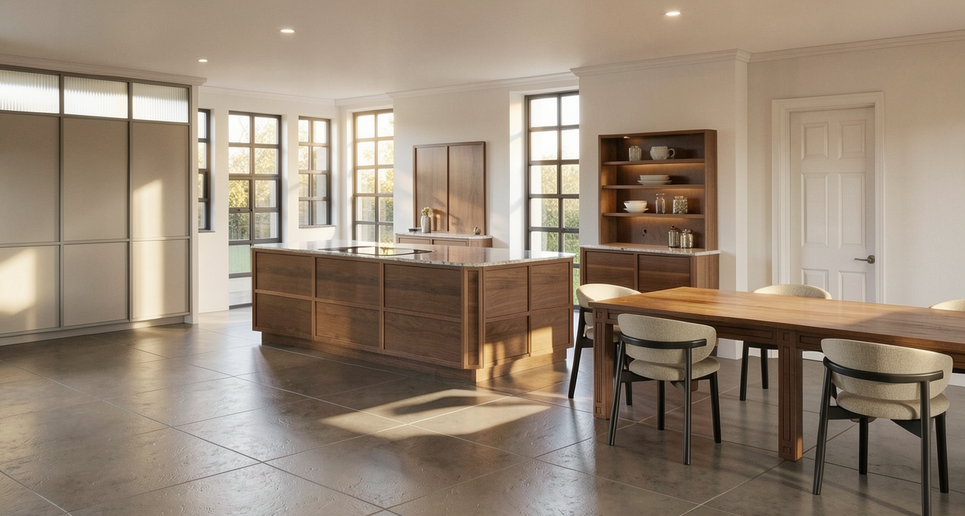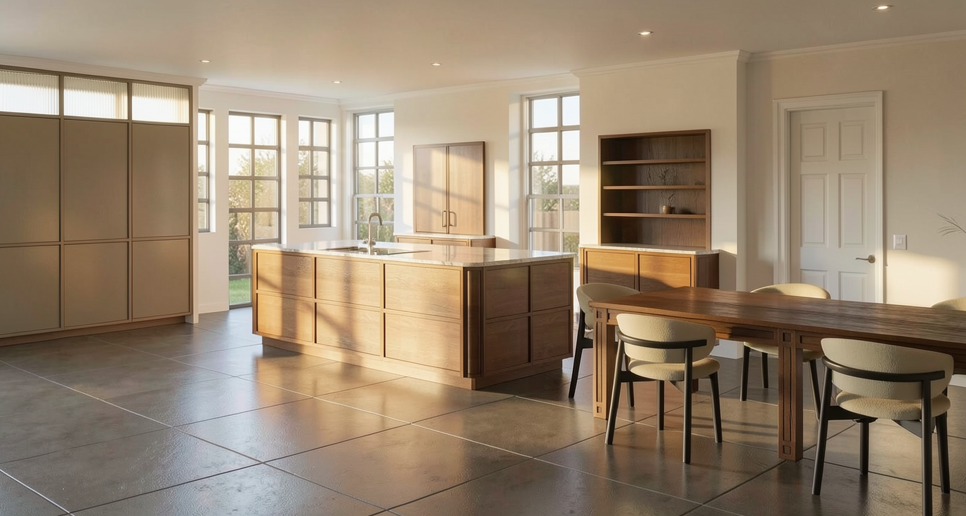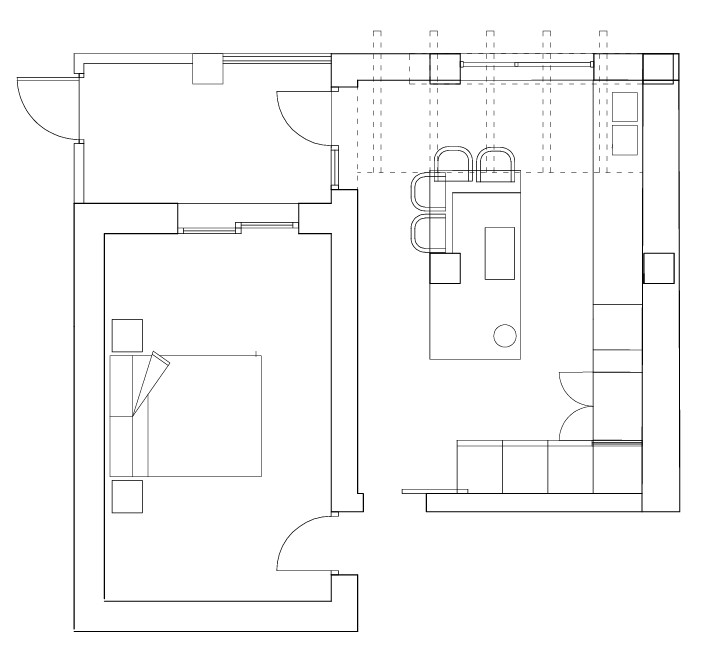 convert this floor plan into a realistic isometric 3d view of a kitchen show the space from an elevated angle with furniture walls and details visible modern style kitchen and bedroom with central island use the same furniture as shows on the plan do not change the orientation of the floorplan