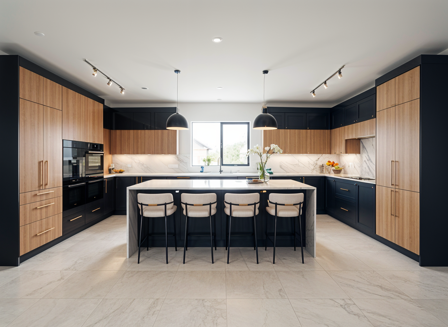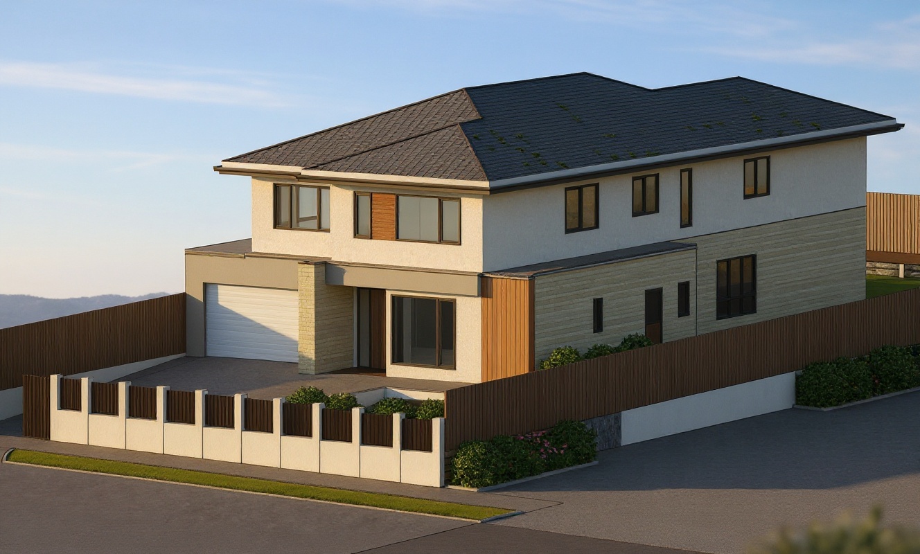 render a modern two story house with a sleek contemporary design the roof is deep charcoal gray creating a striking contrast against the light gray exterior walls incorporate warm wooden accents on the fa ade enhancing the elegance of the architecture add black trim around the windows for a sophisticated touch the left side features a white garage door complementing the clean aesthetic surround the house with a minimalist fence in white and black set the scene on a sunny day casting soft shadows for depth and dimension with a clear vibrant blue sky to enhance the overall ambiance