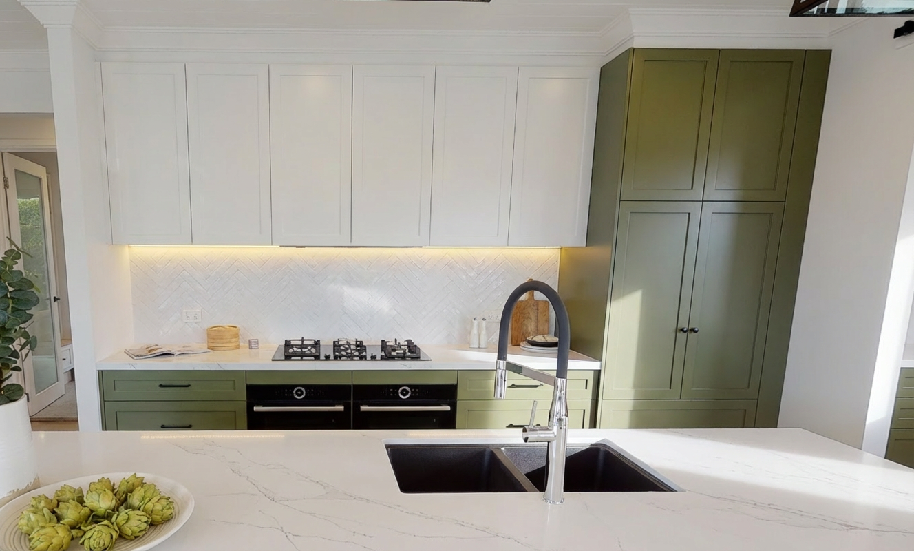 make cooktop just 60cm and oven single make green a little more lighter top cabinets a more bone colur rather than hard white