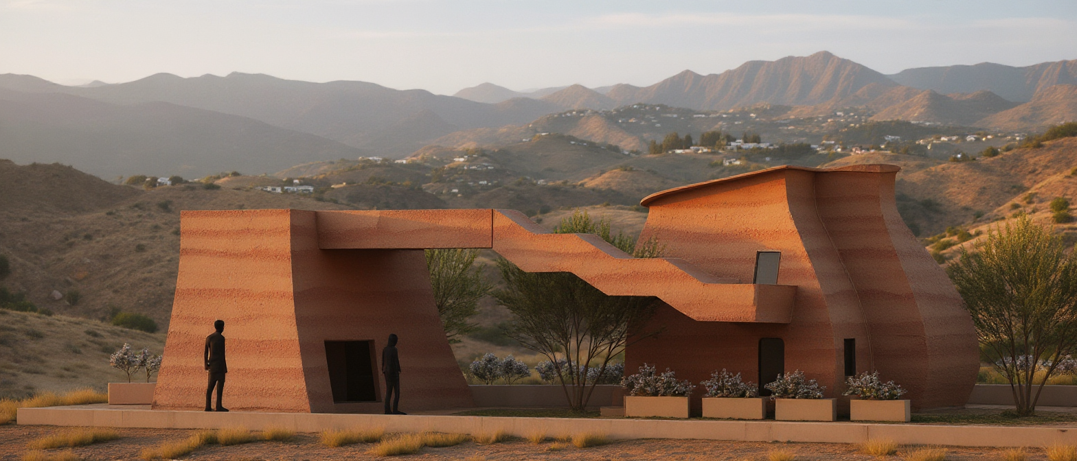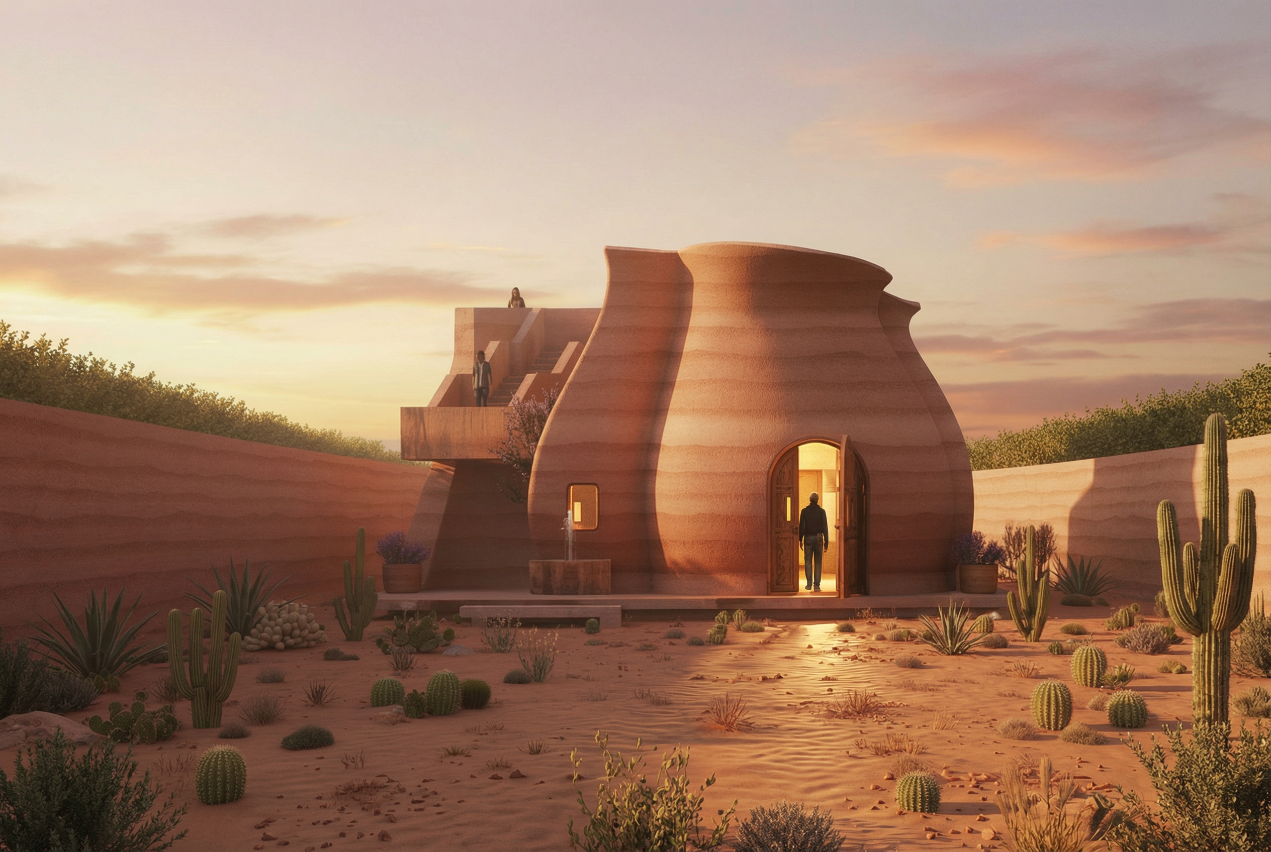 highly realistic architectural visualization of a contemporary rammed earth home in a desert mountain landscape at golden hour maintain the same sculpted curving massing gradient sedimentary rammed earth banding and warm terracotta tones enhance material realism with visible fine textures subtle soil stratification lines and natural surface roughness improve lighting accuracy with soft directional sunlight bounced warm tones and atmospheric depth in the background mountains add natural shadows light occlusion and realistic contact points between the structure and ground keep vegetation true to an arid climate muted greens soft shrubs desert grasses use cinematic color grading high dynamic range photorealistic rendering quality crisp details and physically accurate materials no stylization no exaggerated colors just hyper real yet natural realism