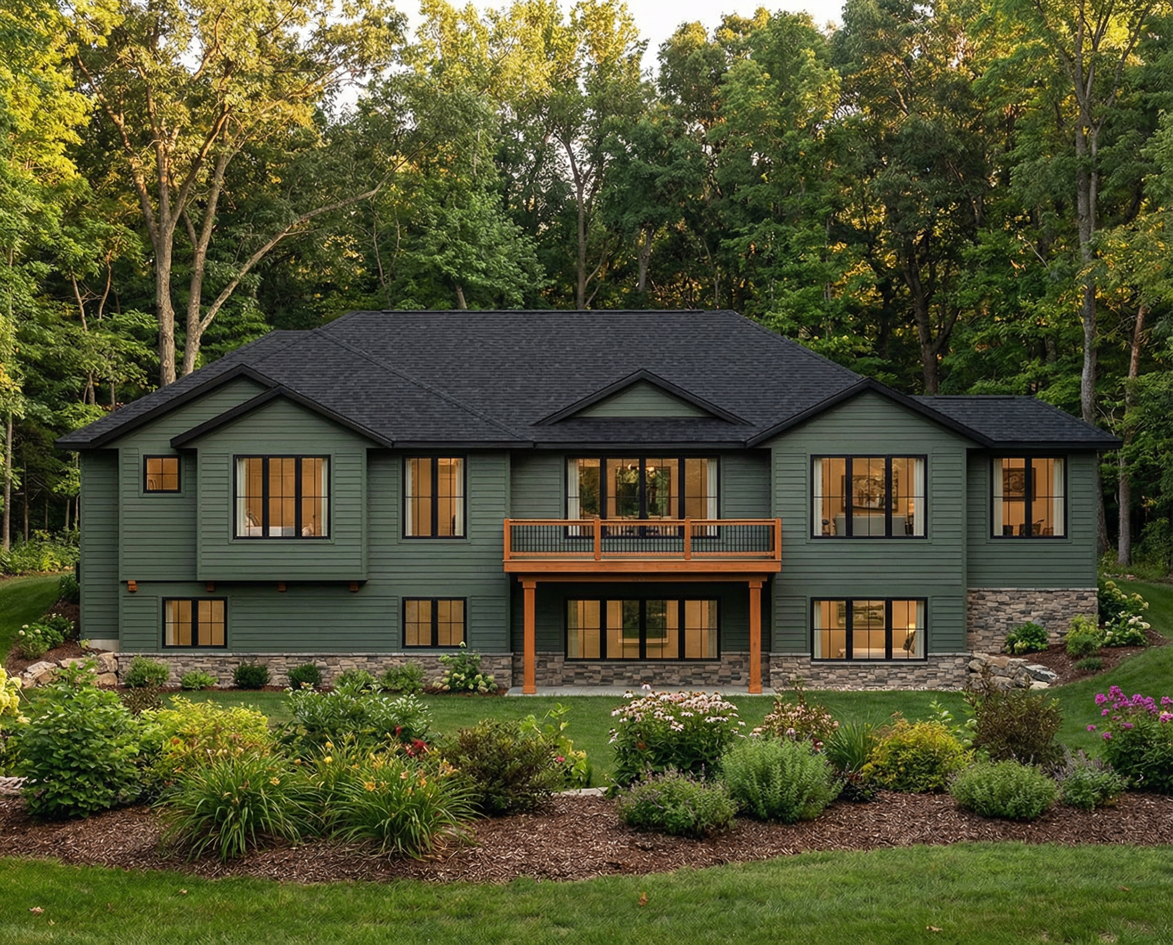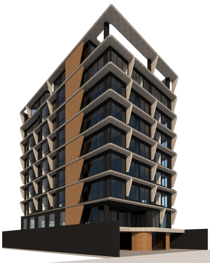 photorealistic architectural render using the exact same camera angle perspective framing and viewpoint as the input image do not change camera position lens focal length horizon line or vanishing points preserve the original architecture exactly as designed same geometry proportions floor heights slab thickness fa ade rhythm concrete structure wood elements and glazing add neighboring buildings on both sides respecting the existing perspective scale and depth of field approximately the same height but with different contemporary architectural styles neutral tones simple geometry so the main building remains dominant add subtle vegetation on balconies realistic planters with controlled greenery integrated naturally without altering balcony dimensions add a few people at street level and balconies for scale realistic proportions natural poses lighting conditions sunset golden hour consistent with the original image direction warm soft light long shadows interior lights turned on in selected apartments only subtle and realistic urban street context high end architectural visualization realistic materials professional quality no change in perspective no camera shift no frontal view no symmetry correction no lens distortion correction no geometry reinterpretation no massing changes no architectural redesign no over stylization no cinematic reframing