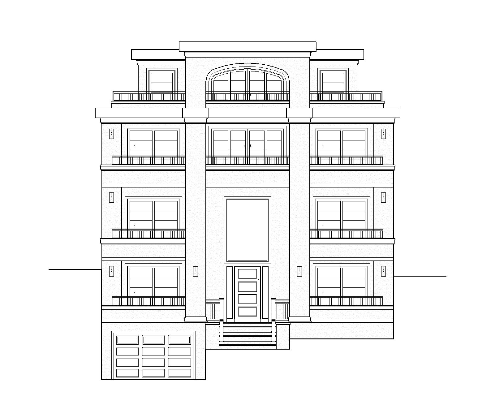 black framed windows contemporary style stucco with modern accents add some mature trees in the background add a walkway to the steps add a driveway to the garage door give the building a modern limestone look add some ornaments add more limestone detail to the building make it early afternoon with a nice sky only make the windows rail door garage and light fixtures look black keep the building and the roof caps a light color make the roof caps to match the building color also add an ultra modern flat water feature centered on the front lawn on the right side do not show any black in the roof caps