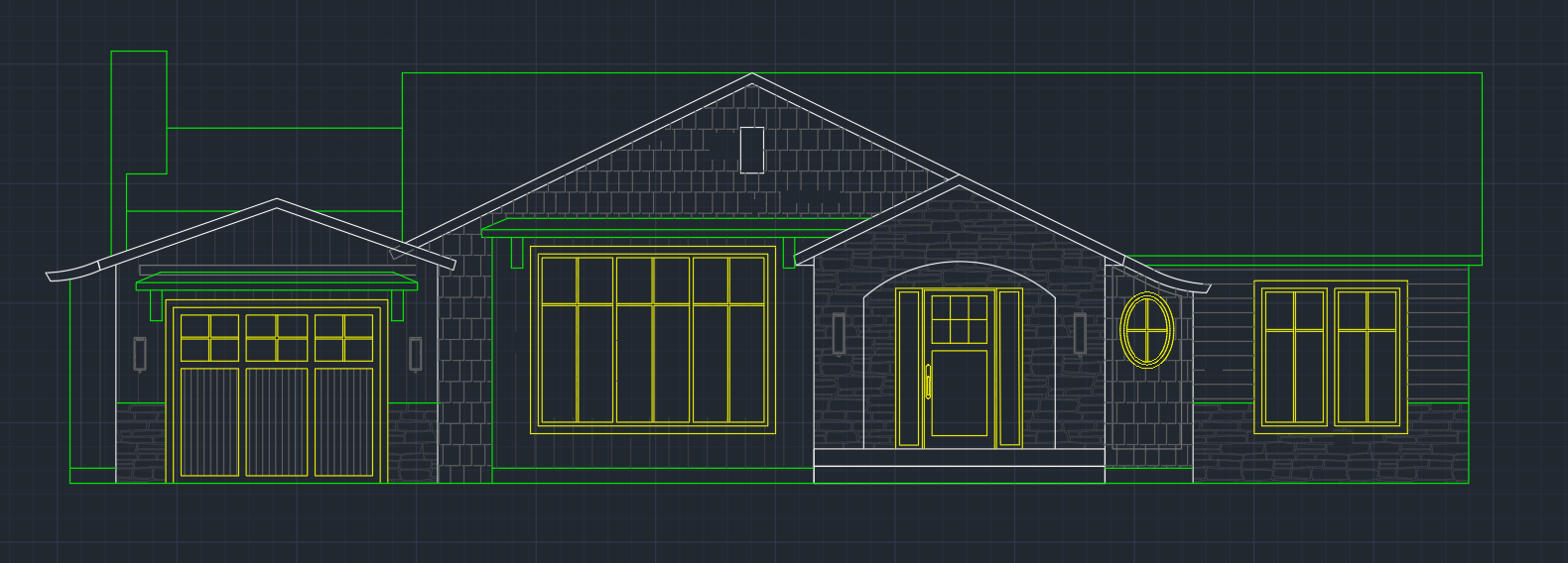 leave everything about the linework and material the exact same only add a pale blue for the shake and lap siding for the color brey and beige stone colors at stone areas and a darker blue in the same color tone as the lighter one on the paneling on the garage and window area to the left of the front door
