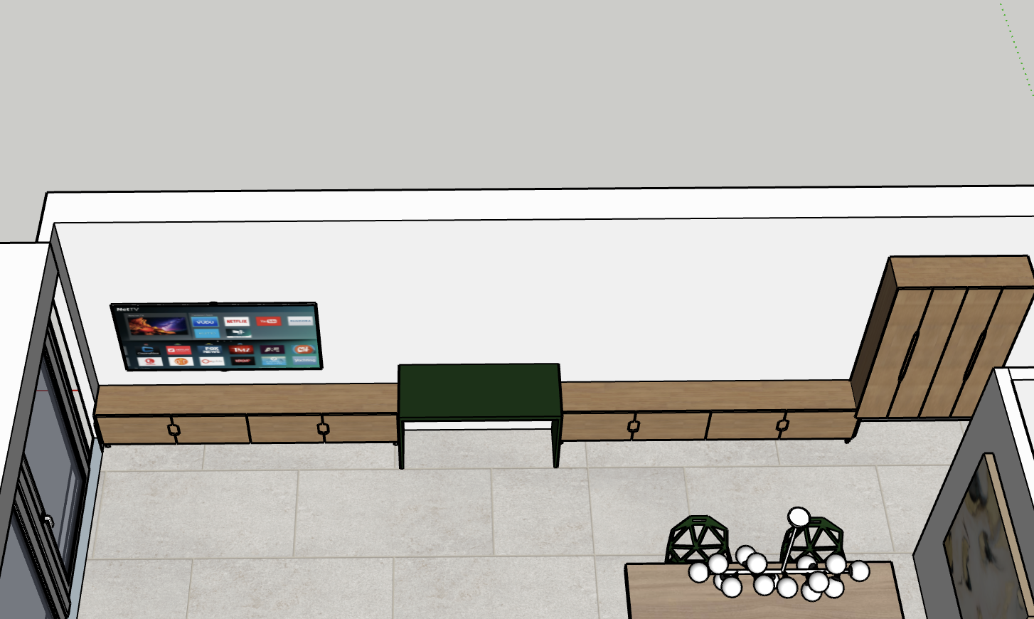 leave the tv where is on the 3d and make same color for wainscot and desk