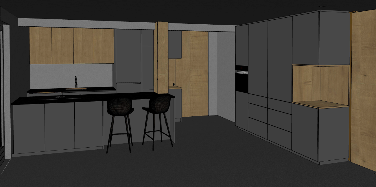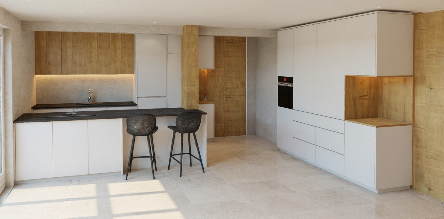sunny morning day in the kitchen the cabinets in white matt surface countertop in black stone led above the sink lightspots on the top for more brightness the floor in beige white tiles like a stone led strip above the sink more light in the front of the kitchen the oak surfaces in oak bright