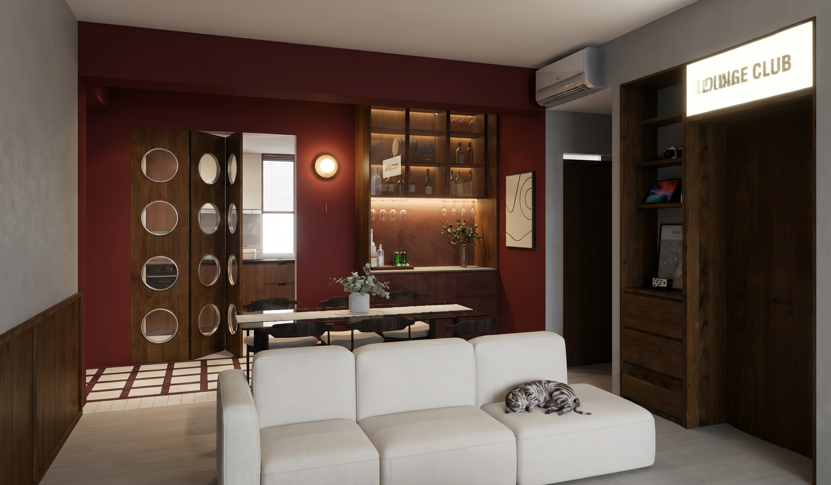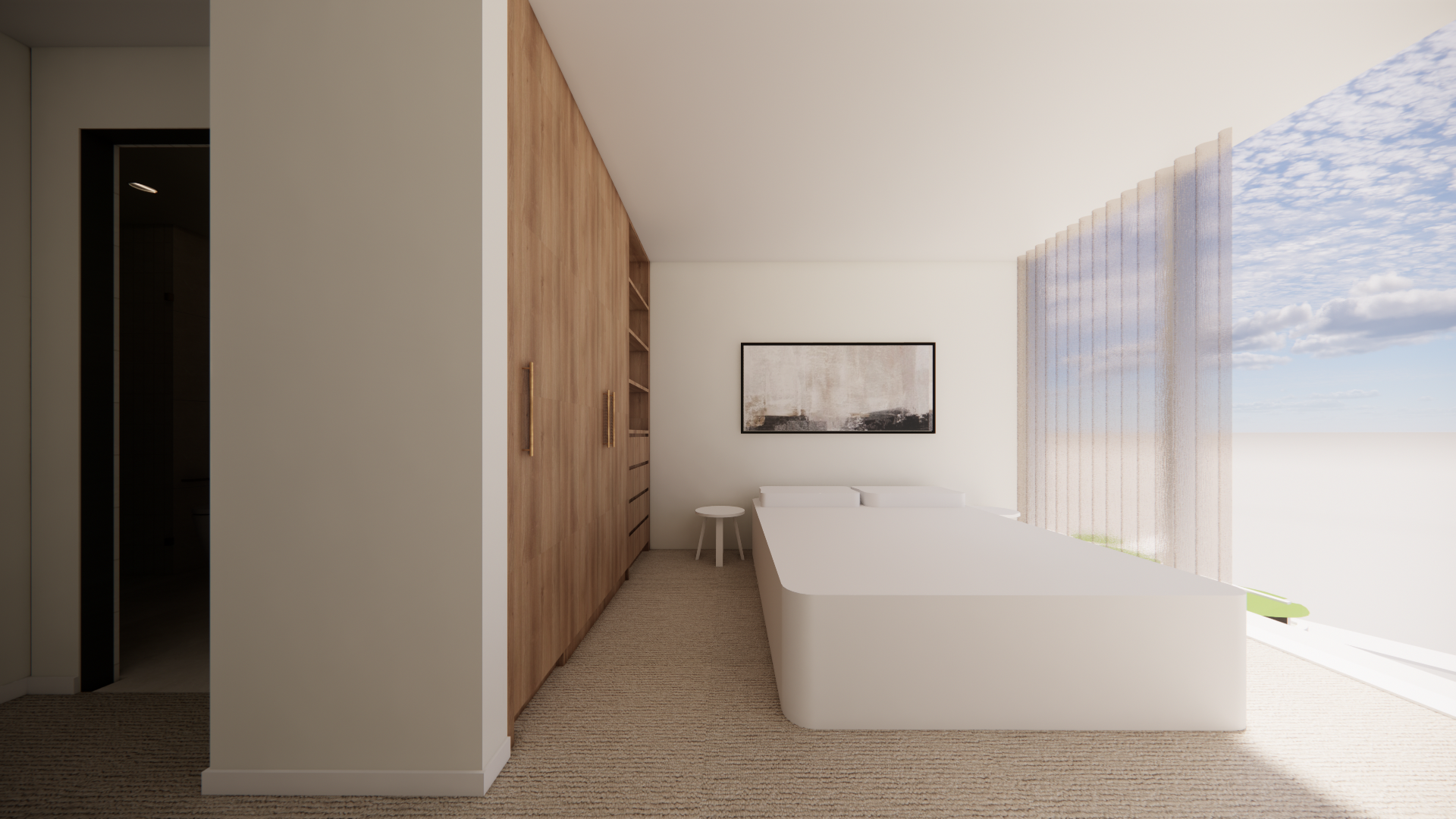 exterior shot using the modboard attatched please use the styling elements into this bedroom replace the bed with the moodboard bed chage the artwork but also dont change anything about the proportions or the finishes of this room