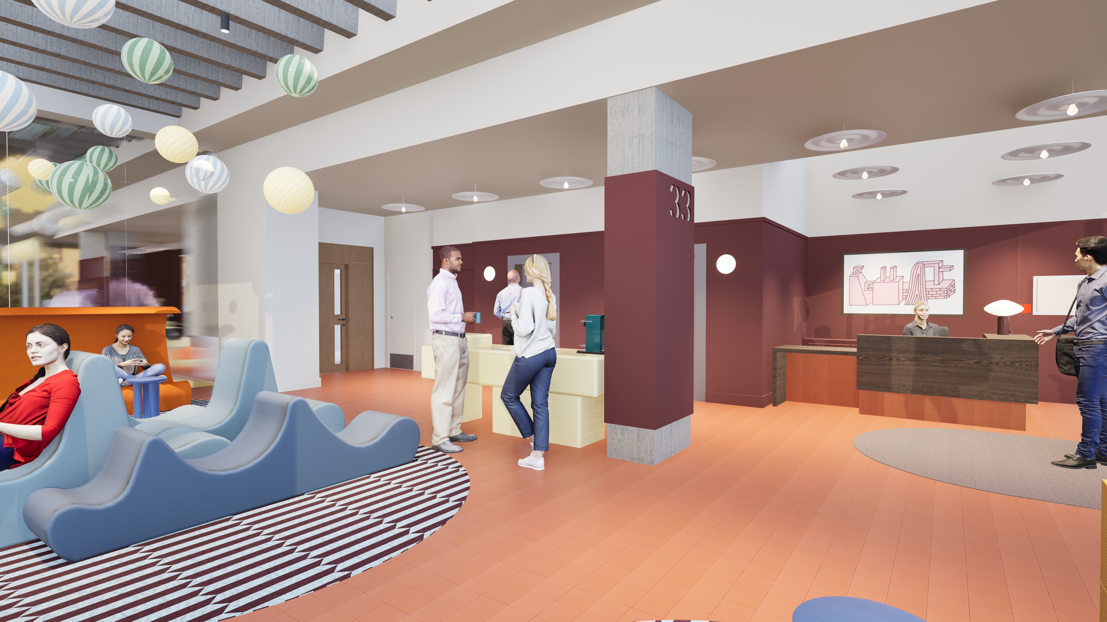 maintain all colours and architectural elements terracotto floor tile to be matte with slight sheen patterned rug and sculptural seating to appear soft enhance realism of lighting materials and people daylight entering from left striped pendant glass globe lights should have a soft glow a mirror at the rear reflects the space