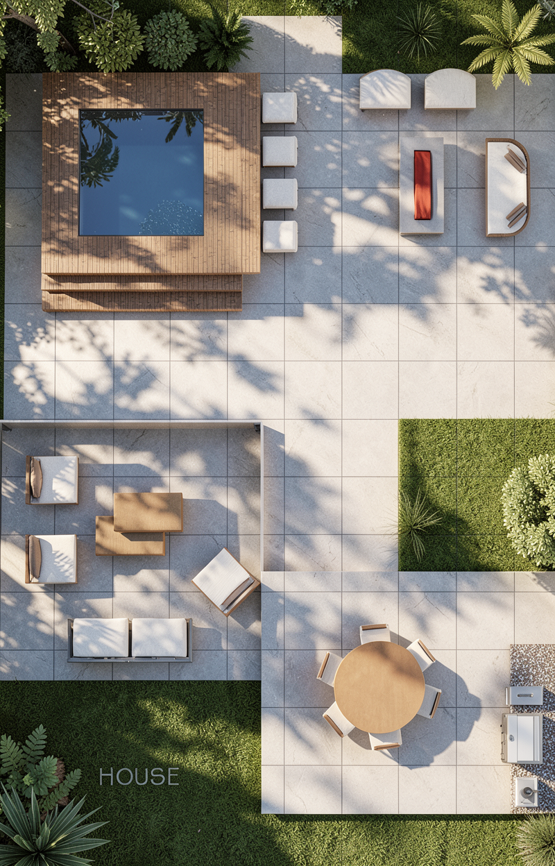 create a photorealistic 3d render of an outdoor area based on the uploaded floor plan