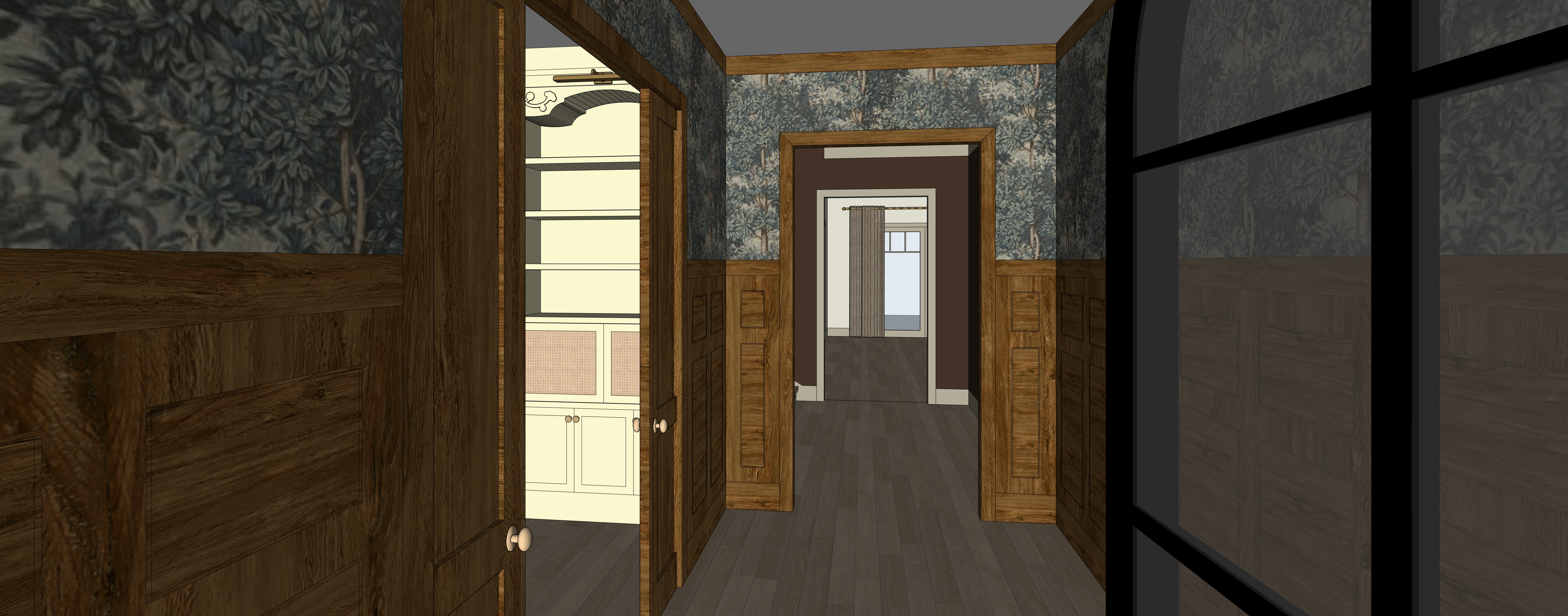 photorealistic traditional hallway finishes rendering prompt create a highly photorealistic interior rendering of a traditional hallway using the provided reference image as a fixed architectural model the layout wall paneling door locations openings trim cabinetry glimpse flooring direction and camera perspective must remain exactly as shown do not redesign reposition or reinterpret any architectural elements this rendering is strictly for finishes do not add furniture or styling elements beyond what is already shown the space should feel refined moody and material driven like a high end concept presentation focused on finishes and architectural character architecture to preserve exactly hallway proportions and perspective wall paneling layout and trim profiles door locations swing and casing details opening to adjacent room at end of hall opening to cabinetry space on the left ceiling height and trim conditions floor direction and layout all millwork profiles and spacing do not add furniture do not alter openings or proportions materials and finishes wall paneling wainscot rich stained wood with depth and variation visible grain subtle tonal shifts slightly aged character matte to low sheen finish no gloss deep shadowing within panel recesses for realism upper walls wallpaper traditional patterned wallpaper with a moody historic feel deep green blue tones with soft contrast matte finish no sheen pattern should feel woven or hand printed not flat or digital trim casings warm wood tone matching paneling slight variation for realism not perfectly uniform flooring wide plank wood flooring natural variation in tone knots and grain low sheen slightly worn high end finish cabinetry visible through left opening paint color benjamin moore dune grass muted earthy green with warm undertones no cool cast matte or soft satin finish do not oversaturate keep tone refined and grounded cabinet inserts if visible soft neutral panels or mesh detail subtle not bright lighting use soft natural ambient lighting only daylight filtering from adjacent rooms even diffused illumination through hallway no harsh shadows or spotlighting no visible artificial light sources or hotspots maintain a slightly moody but clearly visible exposure finishes should read accurately lighting temperature 3200 3600k warm neutral camera settings eye level 5 ft height 28 35mm architectural lens maintain exact perspective and framing high dynamic range ultra high resolution 4k 8k rendering style professional architectural interior photography focused on finishes calm moody refined atmosphere balanced exposure not too dark not bright materials should feel tactile layered and realistic avoid glossiness avoid flat lighting avoid builder grade appearance geometry guardrail critical treat the reference image as a fixed 3d model do not move walls or doors do not change paneling layout do not alter cabinetry location do not change camera angle do not add furniture or decor enhance materials lighting and realism only