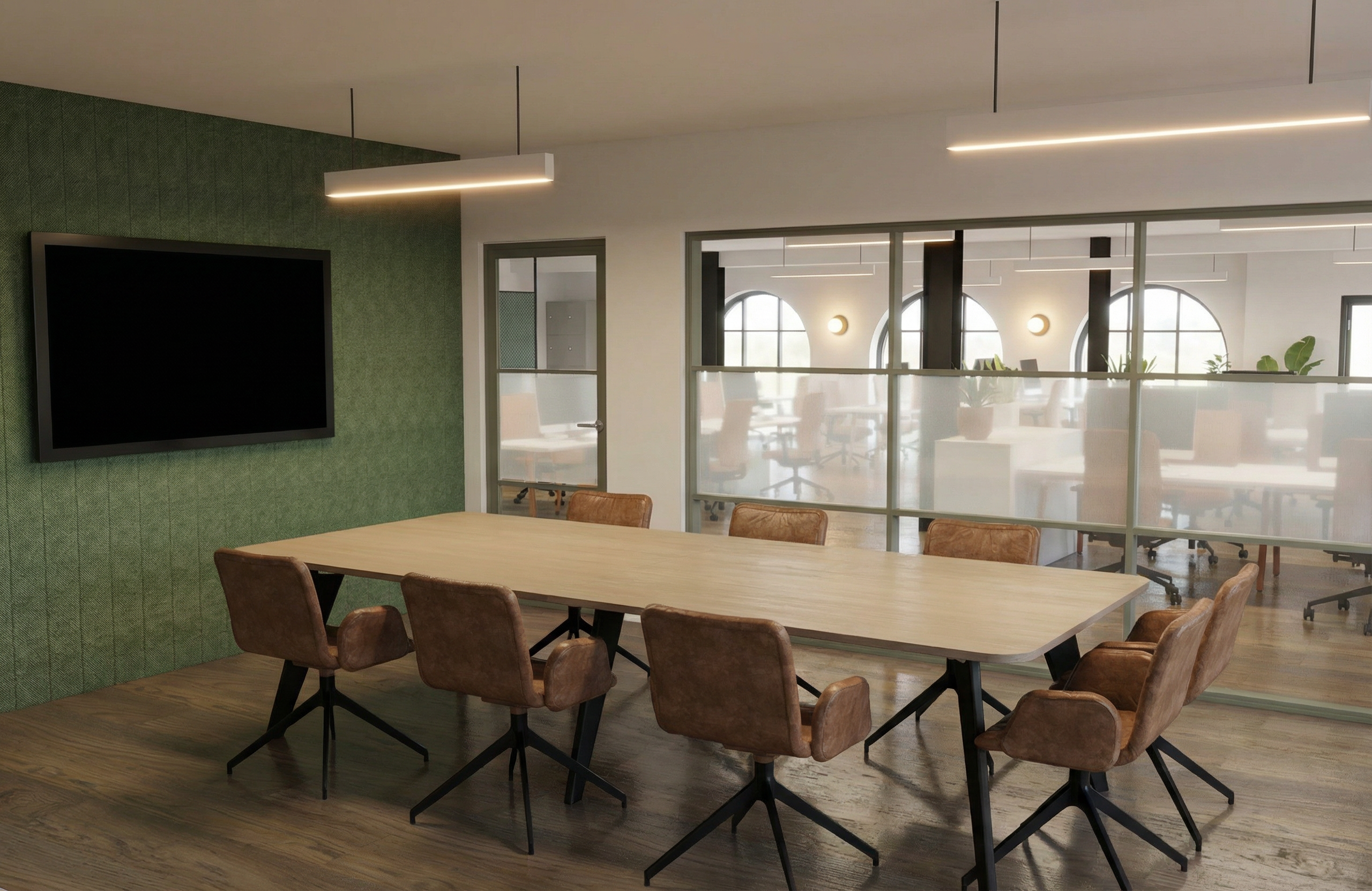 create a modern interior room with a minimalist design the walls are a soft beige color with a painting on the central partition wall the ceiling and remaining walls are painted in a sleek light creame paint the floor is a very light gray marble viening large format tiles polished finish a circular decorative feature with led cove light inside rests on a floating shelf on the partition wall add a pendant light with a frosted glass shade casting a warm glow the dining area features a dark wood table with off white upholstered chairs the atmosphere is warm and inviting with gentle lighting accentuating the clean lines and modern furnishings the back wall pantry in a limewash taupe color with the black polished marble tabletop and backsplash add downlights on ceiling