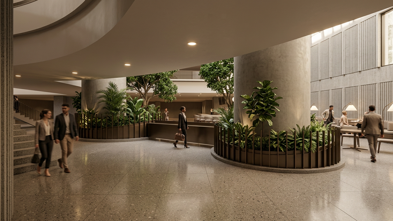 give this building a limestone facade concrete porch with an older lady siting in one of the chairs add furniture inside and glass to the doors