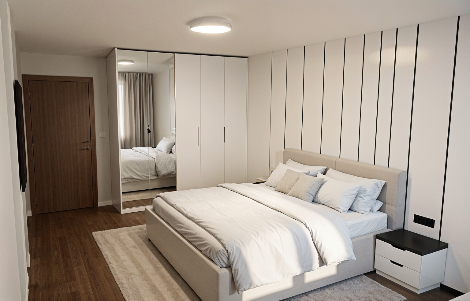 make a rendering of a modern bedroom in neutral colors the bedside table top should be wooden smooth clean white drawer fronts