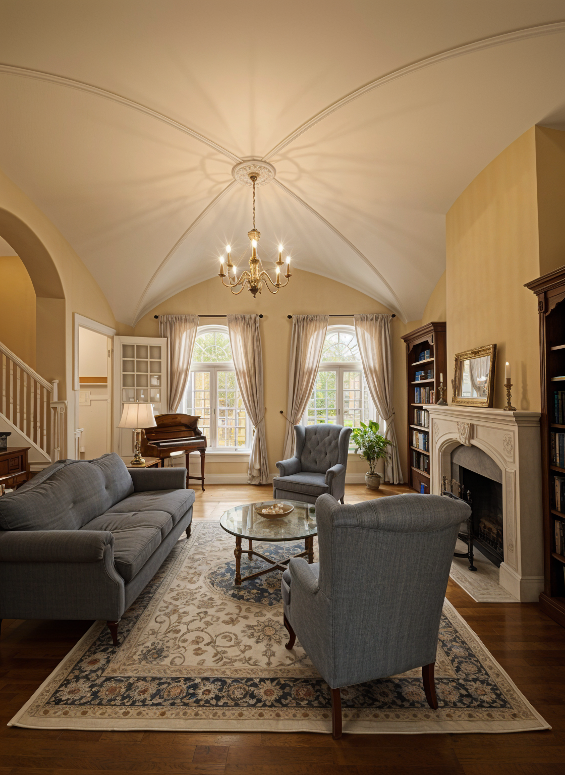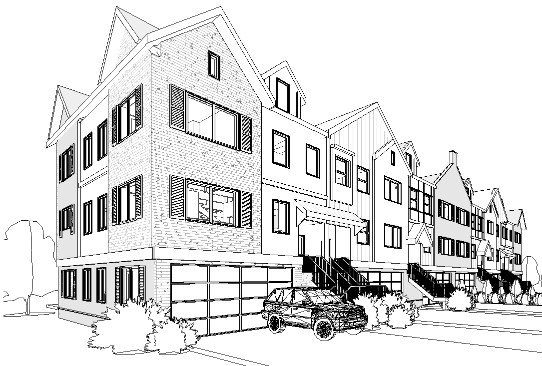 photorealistic image base and corners to be light gray stone the rest of the building should be a variation of white composite panels with black accent details trims canopies and window frames and shutters ambiance should be lively with people walking and some sparce lighting coming form withing the building garage doors to be solid black panels