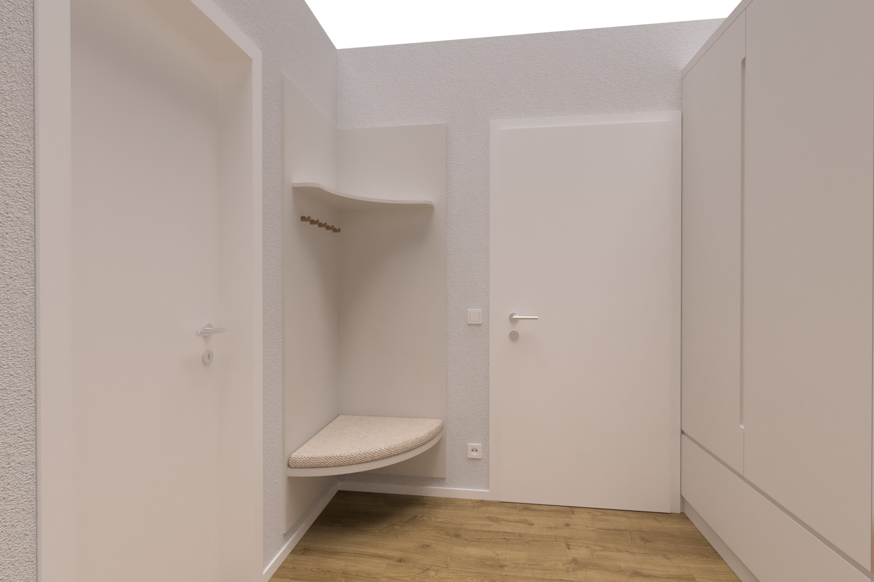 improve the realism of the provided interior render while strictly preserving the original composition do not change camera position angle focal length or framing layout proportions or geometry any furniture design or placement do not add remove or modify any objects the output must be based only on the existing image material and color specifications floor natural oak wood flooring warm tone realistic grain and subtle imperfections right side cabinets chalk painted finish matte soft texture wall panels around the bench same chalk color as cabinets bench seat upholstered cushion in light grey fabric soft textile texture slightly worn realistic fabric shading wall hooks solid oak wood natural finish visible grain doors light white finish matte subtle surface variation door handles stainless steel brushed finish subtle reflections realistic metal response light switch light white next to the door power socket light white positioned near the floor architecture detail the ceiling starts at the same height as the top edge of the right side cabinets lighting create a realistic hallway atmosphere using only artificial lighting no sunlight no daylight contribution soft diffused ceiling lighting neutral to slightly warm temperature 3000 3500k add subtle ambient occlusion contact shadows and realistic falloff ensure natural shadow softness and depth especially under the bench and around corners rendering quality enhance global illumination and indirect lighting add subtle imperfections micro texture slight roughness variation improve material realism pbr accuracy maintain clean minimal aesthetic without exaggeration goal achieve a highly realistic calm hallway atmosphere using only artificial lighting while staying fully faithful to the original design and image