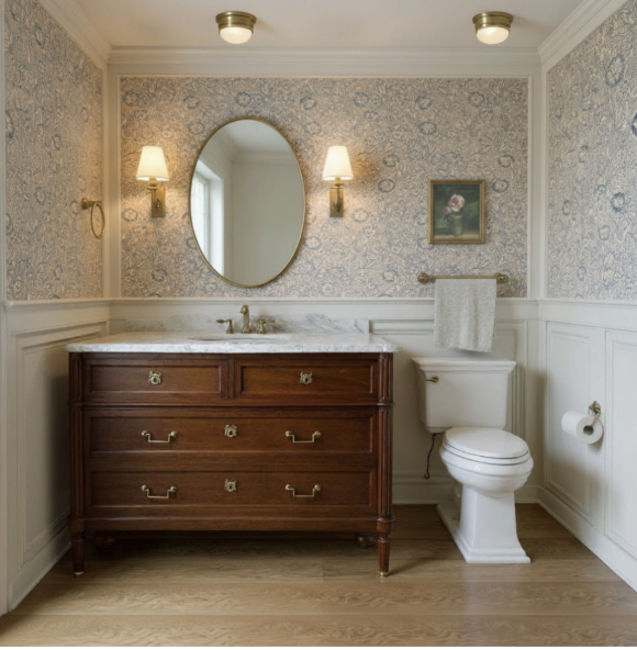 render this in a photo realistic way update the wallpaper to be forest toile blue by sanderson