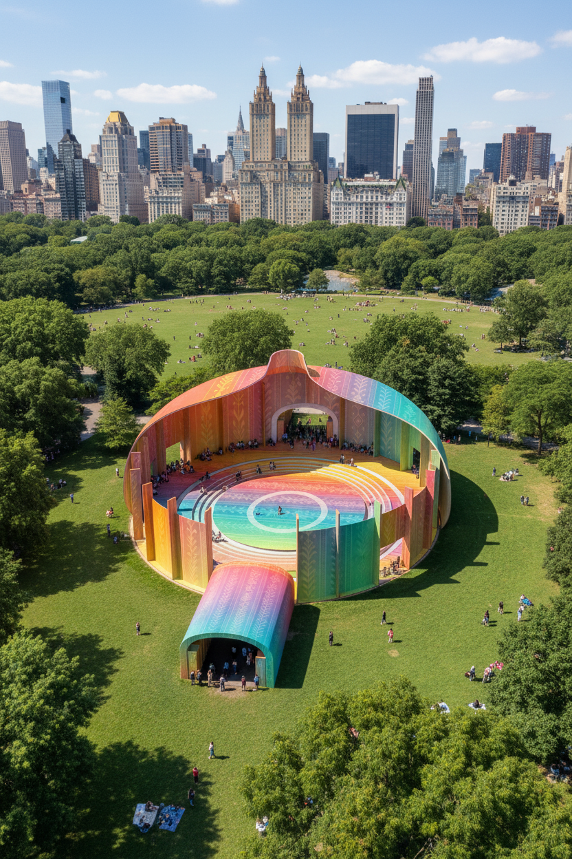 location is central park at the sheep meadow i want it in a ariel view and the standing wall stands will be the given 2nd multicolor wallpaper design in reference and it will exactly look the 3rd picture in the reference and i want the floor to be the starlight floor theme as given in the 4th picture in the reference and the want the entrance and exit to look like the 5th picture in reference