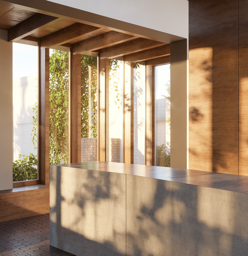create a photo realistic render this view from the rear covered patio of this home this is a rural lot no homes in view it is a wooded field behind the home no mountains clear sunny day with a deer grazing in the mid distance add a celing fan and modern outdoor furniture and outdoor kitchen
