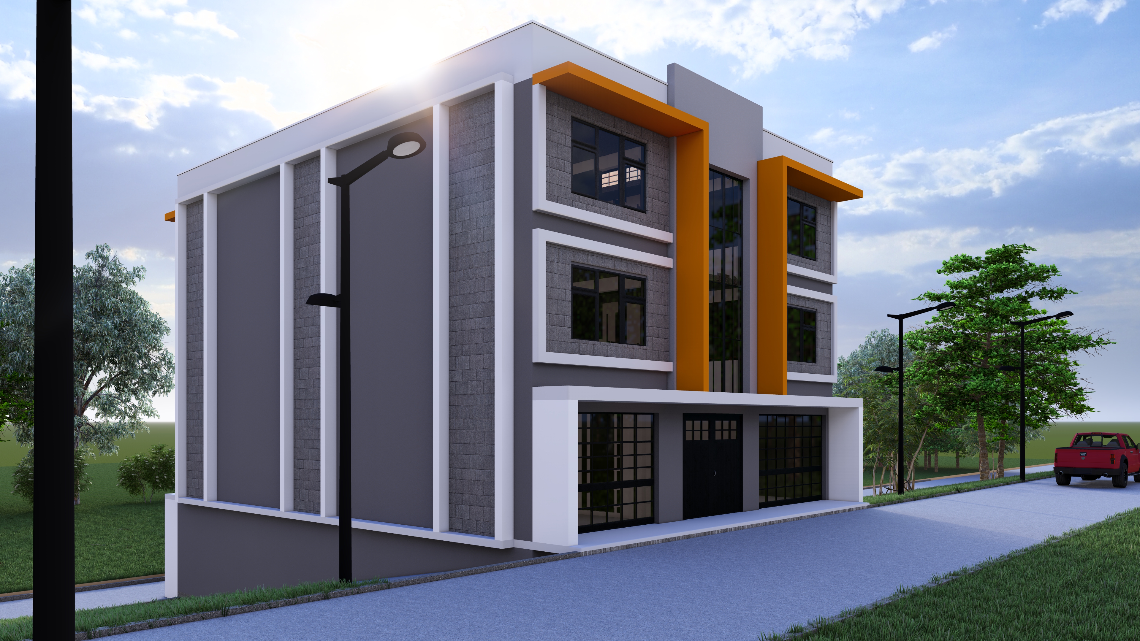 image of apartment building with grey white and burnt orange tones increase exposue add a very light yellow shade of indoor warm lighting add downlights to the protruding orange slabs add lights to the street lights make it very crisp and increase texture make it very photorealistic and wel granulated