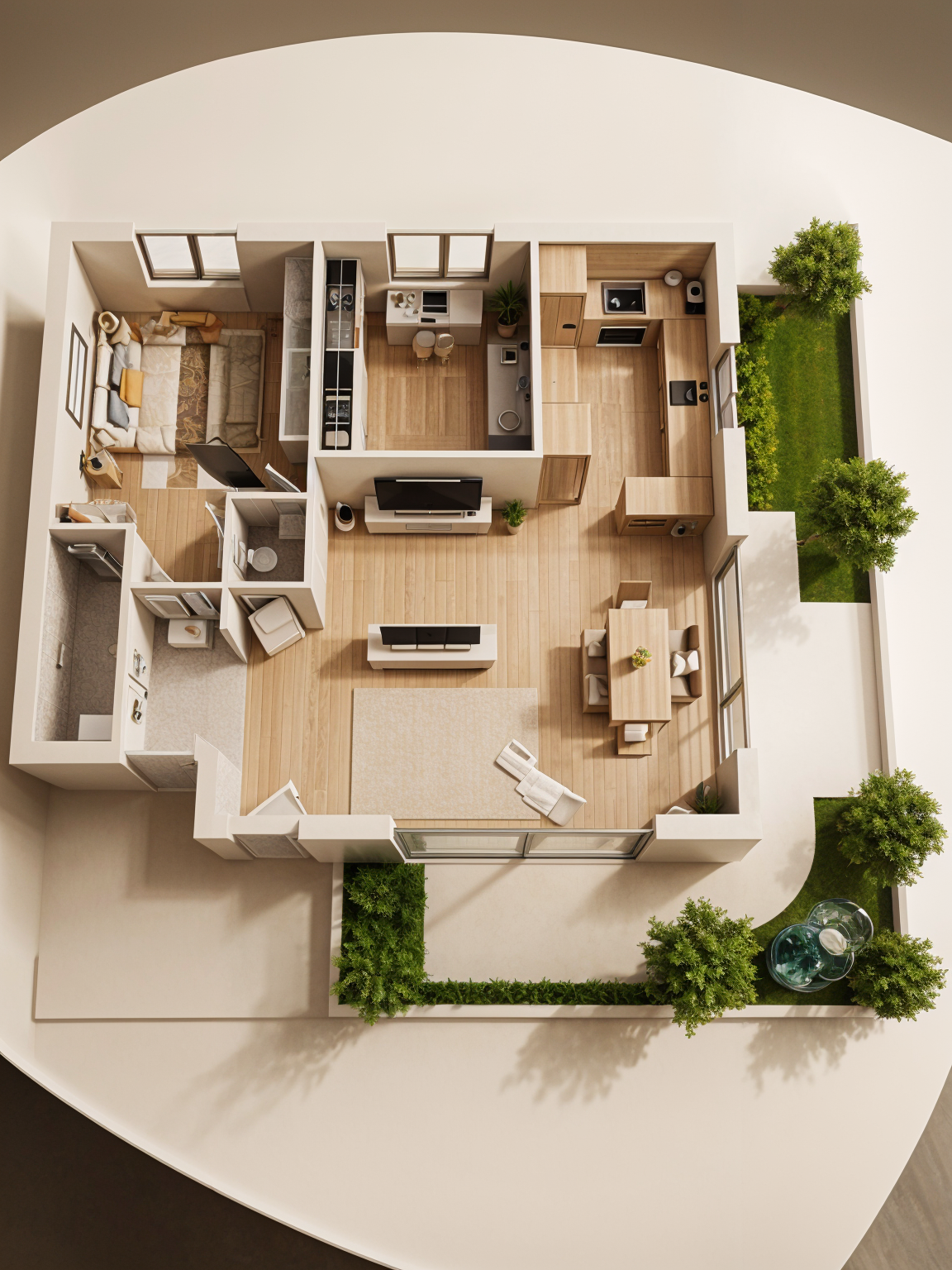 new urbanism exterior shot render a modern suburban house with a bright and inviting atmosphere the house has a classic design with three gables and a two car garage the exterior walls are color and material blocked soft wood paneling and deep dark gray the roof is a sleek dark charcoal gray black windows with grids the front steps and entryway are made of light gray stone surround the house with lush green grass and tall mature trees casting soft shadows the sky is clear with a gradient from azure to soft pink as if it s early evening architecture