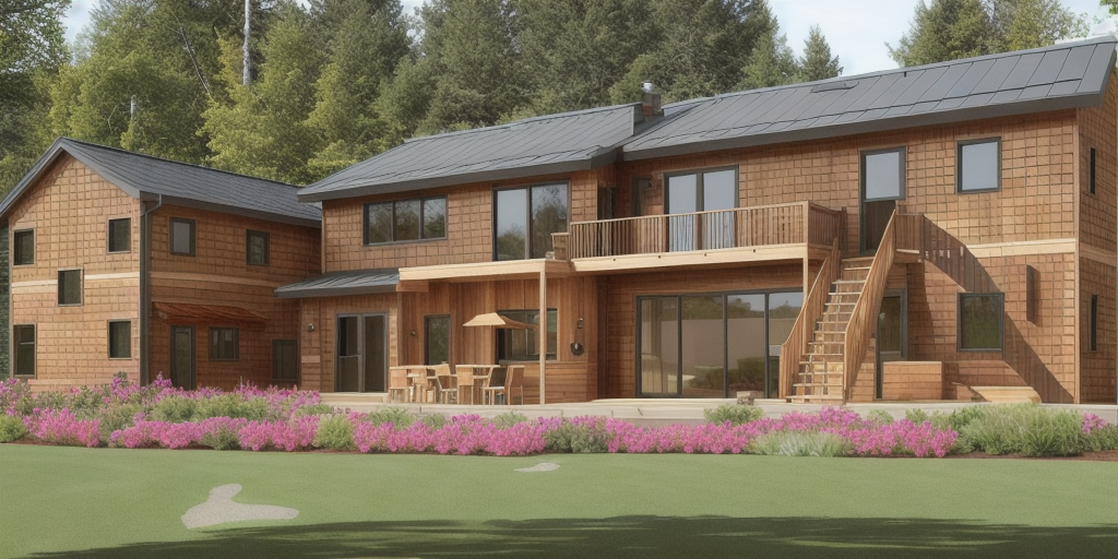 render a modern curved building with sleek rounded edges and horizontal layers use light beige and warm wood tones for the building with large reflective black glass windows add lush greenery and palm plants along the base the surrounding wall should be a dark charcoal gray with smooth textures include a paved sidewalk in light beige stone and a black asphalt road contrasted with luxury cars in metallic silver white and green create a clear bright blue sky for a sunny atmosphere casting soft shadows for depth and realism add a urban context with buildings with a modern design