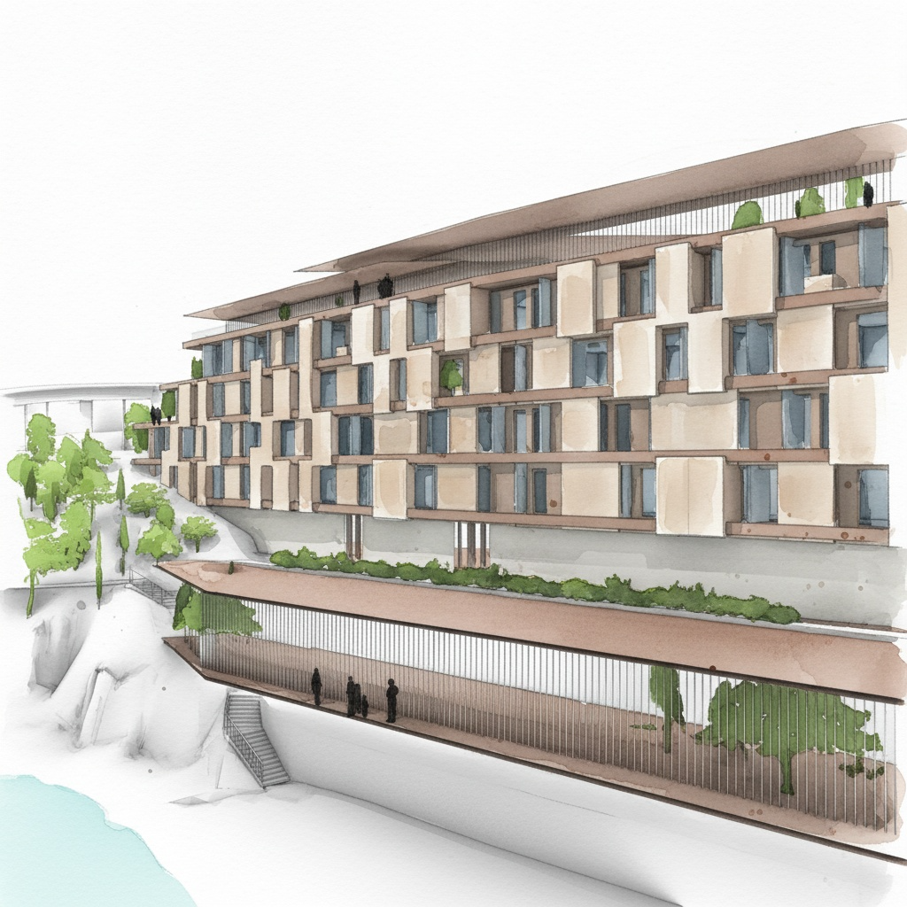 concept for a boutique hotel that plays with the depth of the fa ade consisting of a variety of solid stone elements that appear to be hanging and screen panels behind them the overall effect is one of complexity and richness enhanced by the addition of greenery