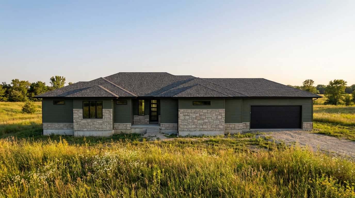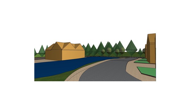 make a hyperrealistic visual of this view the buildings are to be local materials including black timber cladding brick and flint cream render and red brickwork the blue is a wild planted balancing pond to introduce biodiversity show rish planting around this and make this area elegant and deriseable and classy add people a car on the road and cyclists dont change image and keep identical to the angle of the original picture the building on the left is a medical centre with a flat roof the builiding ont he left is housing with pithced roofs