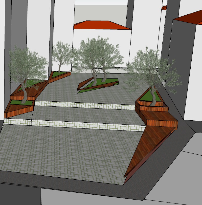 urban square redesign in a mediterranean city inspired by the existing courtyard shown in the image the scene features old brick and stone fa ades olive trees warm light and a calm community atmosphere design a contemporary yet contextual public space with natural materials such as wood stone and terracotta include minimal street furniture shaded seating areas planters with greenery and soft lighting for evening use keep the pedestrian flow open and inviting maintain the local charm and integrate modern architectural elements with respect for the historical textures highly detailed realistic architectural rendering daylight scene
