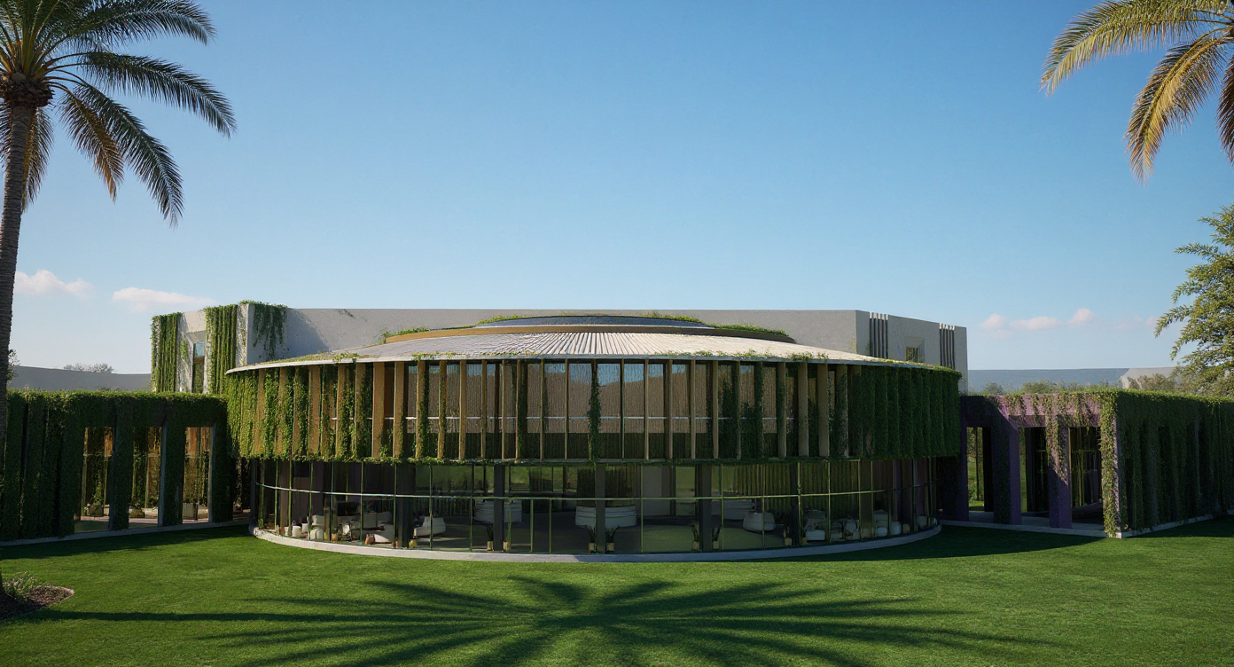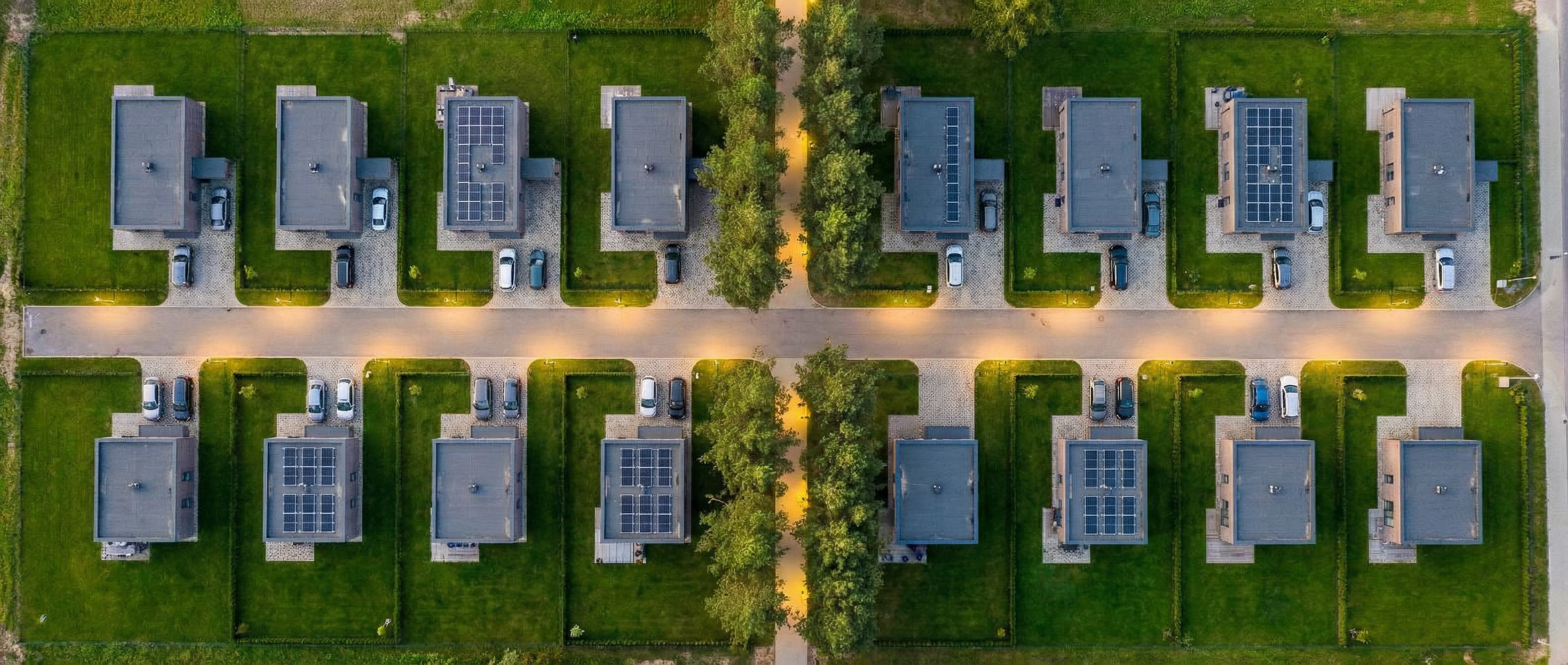 draw a realistic top down projection of a neighborhood block the houses are single story with flat roofs the roofs are flat and covered with bitumen some roofs have solar panels there are two cars parked next to each house around each house are concrete paving stones and grass is planted around them the central street is asphalted parallel to it there is an alley planted with scots pines with street lamps glowing yellowish and a path