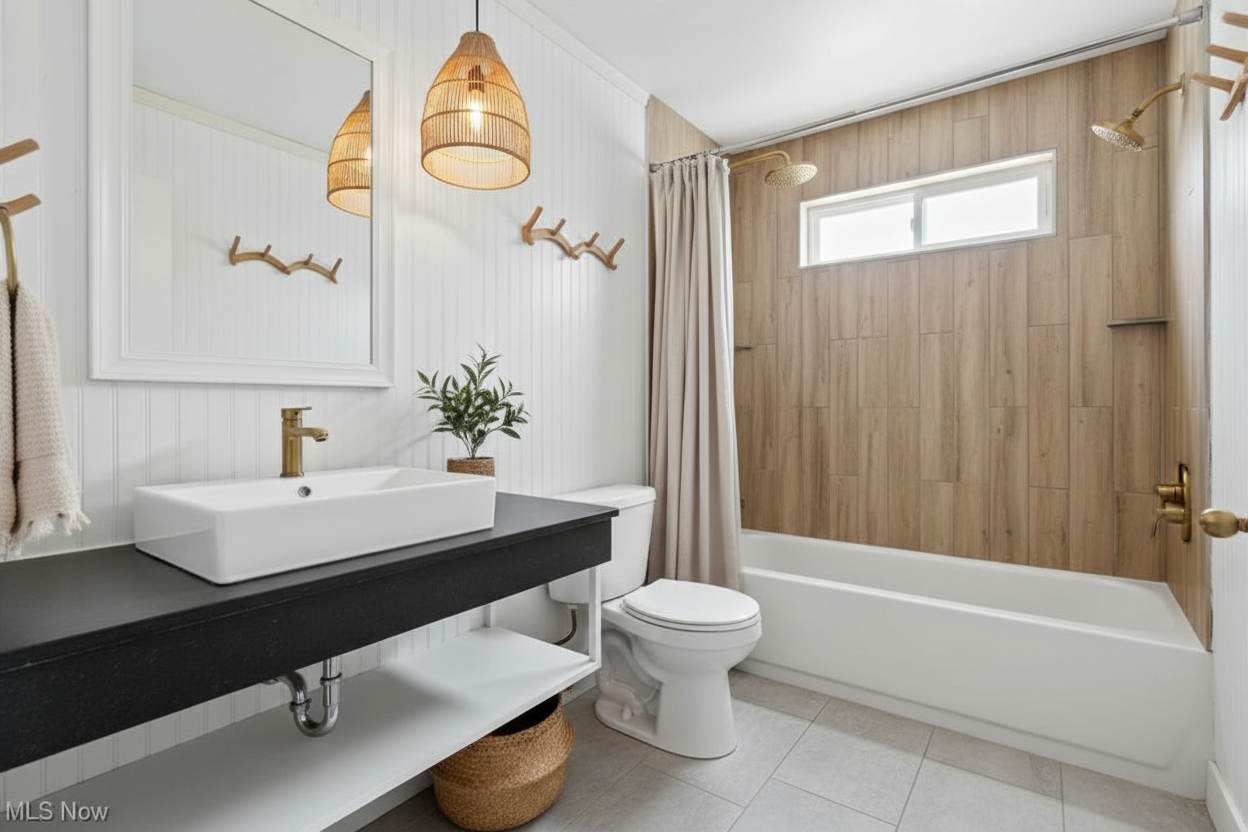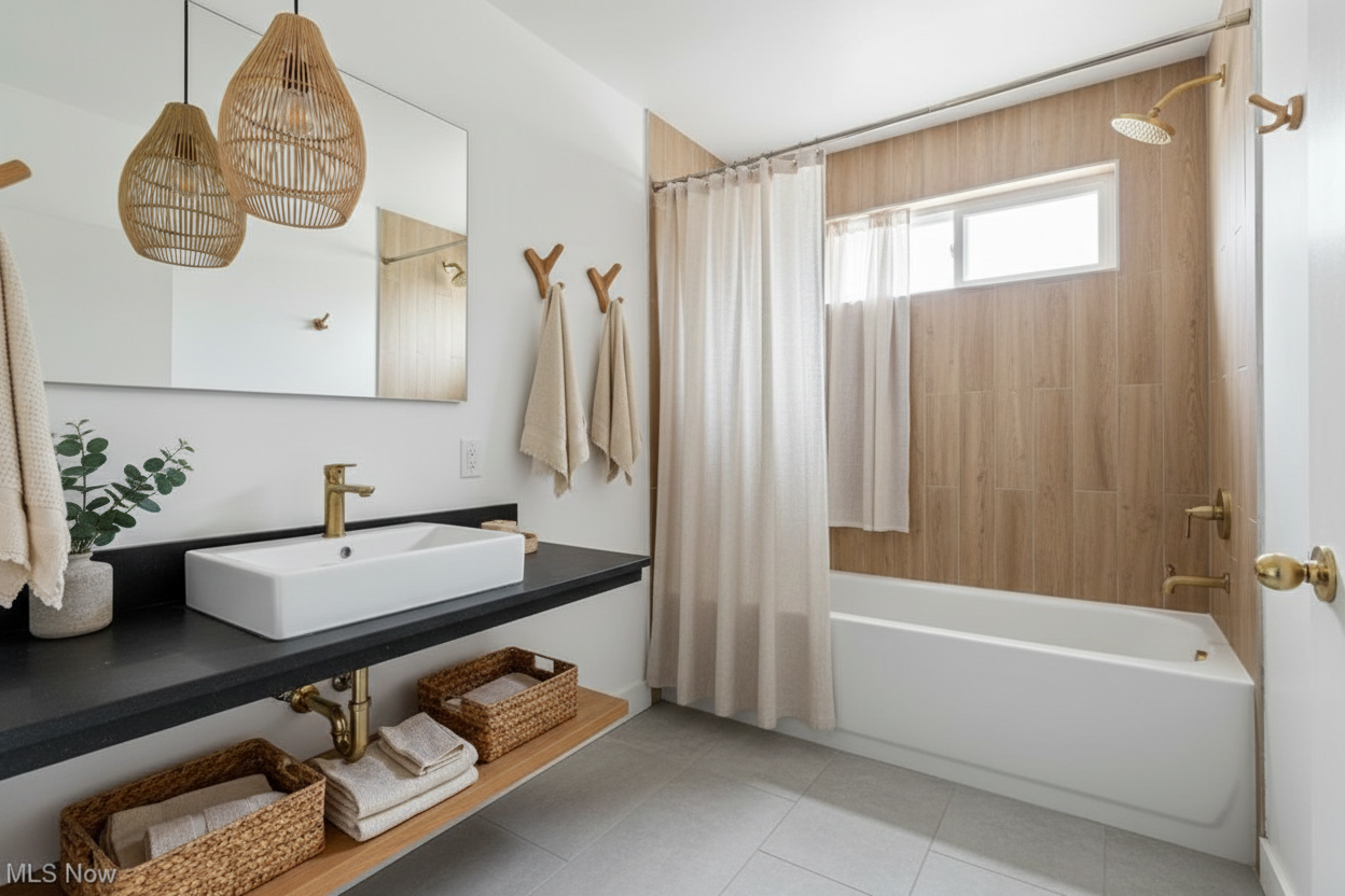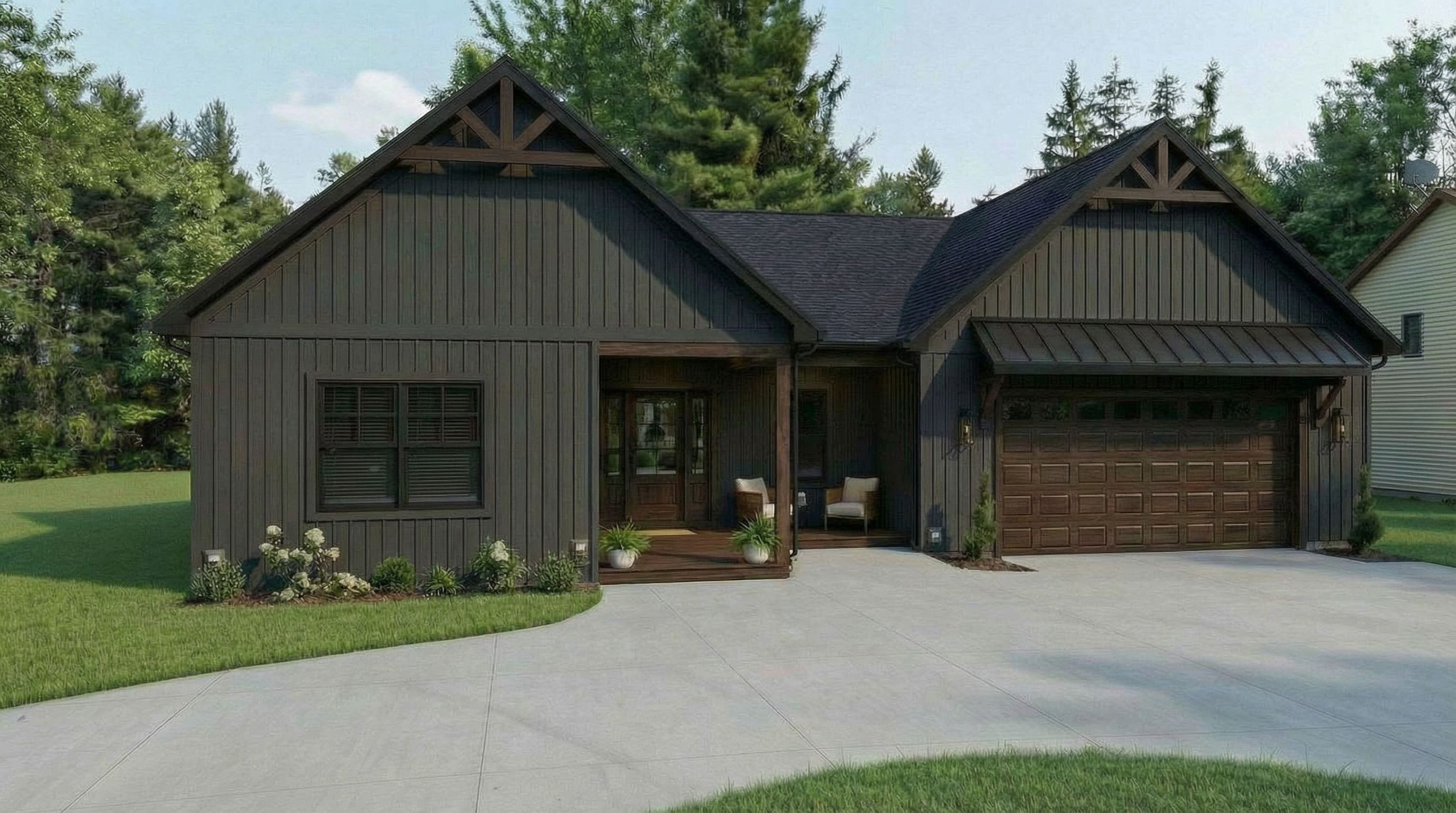 dark grey siding black trim around windows mid day so the sun isnt too bright light layer of snow over everything
