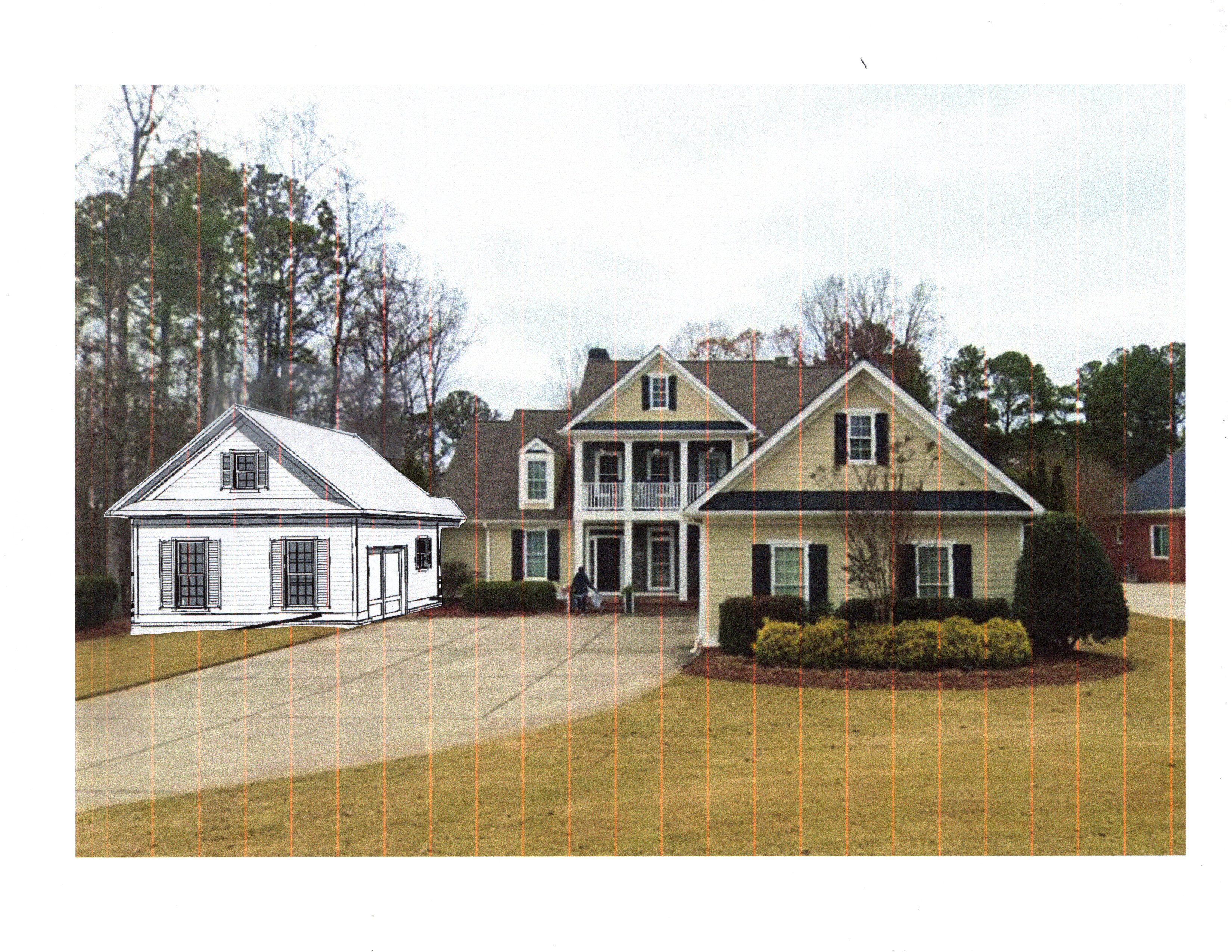 utilizing the provided image generate a new photo realistic rendering keeping all of the architecture exactly the same keeping the original colors of the existing house tanish yellow siding white trim black shutters and apply them to the drawing portion of the picture