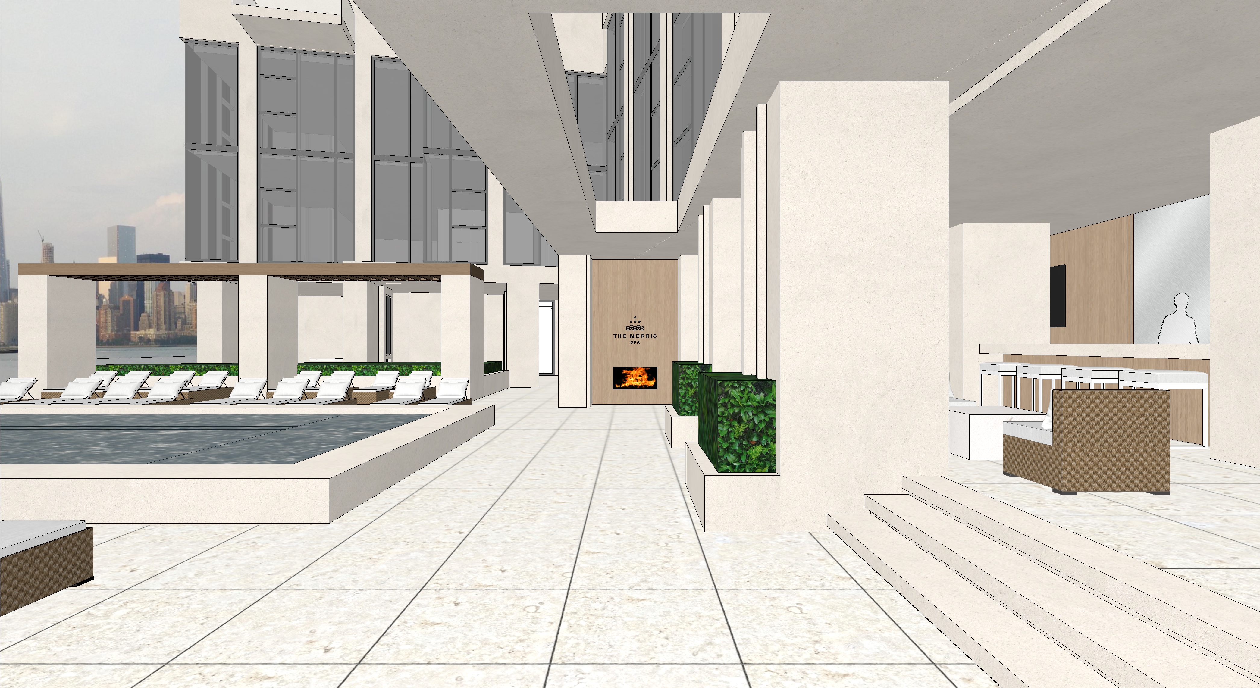 using the provided image as the exact base model render a fully photorealistic luxury spa and pool courtyard do not alter redesign move or reinterpret any architectural geometry proportions camera angle layout glazing divisions columns ceiling forms steps or furniture placement maintain the exact perspective and composition architecture pool the space is a tall double height atrium with floor to ceiling glazing on the left overlooking a waterfront city skyline a long rectangular pool floats precisely 2 inches above the large format limestone flooring separated by a continuous recessed shadow gap containing a dim warm linear led light wrapping the entire perimeter the pool water should appear deep and translucent with gentle ripples realistic refraction subtle caustics and soft reflections of the surrounding architecture surrounding elements along the left side of the pool maintain evenly spaced modern white chaise lounges with slim metal frames positioned beneath the integrated wood slat pergola low linear planters with dense manicured green hedging sit between seating and glazing materials flooring large format honed light beige limestone with subtle tonal variation and soft grout joints walls columns smooth off white limestone or honed travertine with natural mineral texture wood elements warm light oak with tight grain and satin finish glazing clear glass with realistic exterior depth and atmospheric haze fireplace linear built in unit with layered flame glowing embers and warm light spill onto surrounding wood paneling right side lounge bar area maintain the light wood bar with clean modern detailing built in cabinetry woven lounge seating in warm natural tones and integrated rectangular green wall planters recessed into architectural niches lighting late afternoon daylight streaming through the glazing with soft golden warmth natural shadow gradients across floors and columns subtle indirect ceiling illumination warm accent glow from the fireplace balancing cooler daylight tones accurate bounce light and global illumination throughout rendering quality ultra realistic materials ray traced reflections accurate scale natural depth of field high dynamic range lighting soft atmospheric perspective toward skyline 4k resolution physically accurate rendering high end hospitality visualization quality mood serene refined spa like tranquility airy luxurious calm