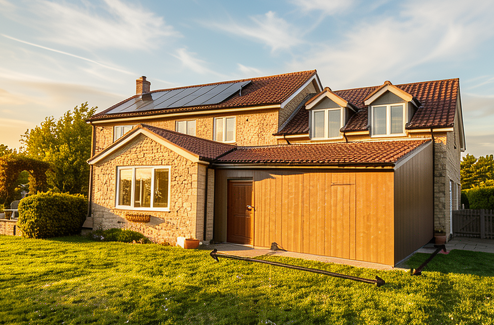 change the timber cladding to stone change the door to white upvc with glazing remove black lines from grass keep everything else including the colours of stone and roof exactly the same as source image