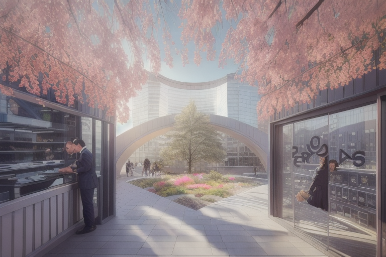 create a wedding venue scene in this room with an extravagant modern arch decorated in white flowers and blush linens to match the wall art remove the chairs