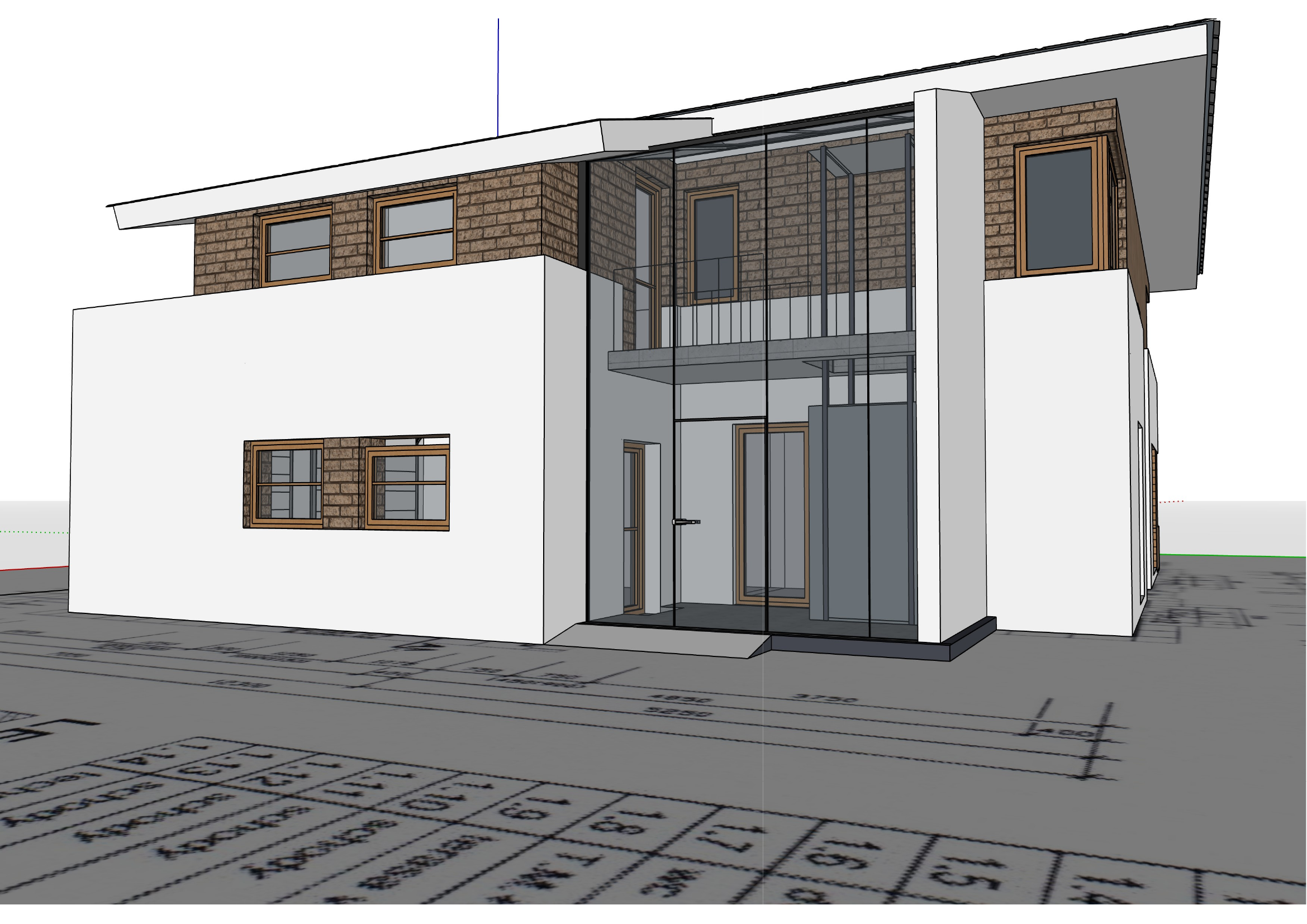 ultra photorealistic architectural visualization based exactly on the provided png reference strict preservation identical camera angle framing and perspective exact building geometry and proportions no redesign no added architectural elements preserve glass atrium structure exactly maintain all facade divisions and window placements architecture description modern two story family house with dominant glass entrance atrium key features full height glass atrium spanning two floors visible interior balcony and entrance space upper floor in warm brown brick cladding lower floor in smooth white plaster minimalist modern geometry with clean lines atmosphere luxury rain scene light rain or recent rainfall wet surfaces not heavy storm wet ground reflecting lights and architecture subtle raindrops visible in air fine cinematic soft mist humidity in the air dramatic but elegant mood lighting podve er kl ov exterior dim blue hour ambient light soft sky illumination after sunset subtle cool tones outside interior warm interior lighting 3000k 3500k visible through glass atrium glowing interior creates strong contrast light spilling onto wet ground d le it interi r mus b t viditeln a realisticky za zen modern luxury style glass atrium hlavn efekt highly realistic reflections wet evening mix of interior visibility exterior reflections sky environment raindrop streaks on glass very subtle physically correct refraction materials enhanced by rain brick facade slightly darker when wet richer contrast enhanced texture white plaster subtle darkening from moisture soft reflections wood frames slightly deepened tone wet effect natural satin reflection ground wet concrete stone reflective surface mirror like in places small puddles metal glass realistic wet reflections increased specularity environment clean minimal surroundings wet pavement reflecting building lights no people no cars optional very subtle landscaping darkened by rain camera eye level 1 6 m focal length 28 35mm cinematic framing slight depth of field render settings ultra high resolution 8k ray tracing on global illumination on high reflection accuracy physically based rendering pbr realistic caustics in glass if supported post process cinematic cinematic color grading contrast warm interior vs cool exterior soft bloom on lights subtle vignette no overdone hdr strict geometry lock preserve glass atrium exactly no structural changes no design interpretation photorealistic rainy evening atmosphere only interior fully furnished modern luxury interior design warm lighting visible depth through glass